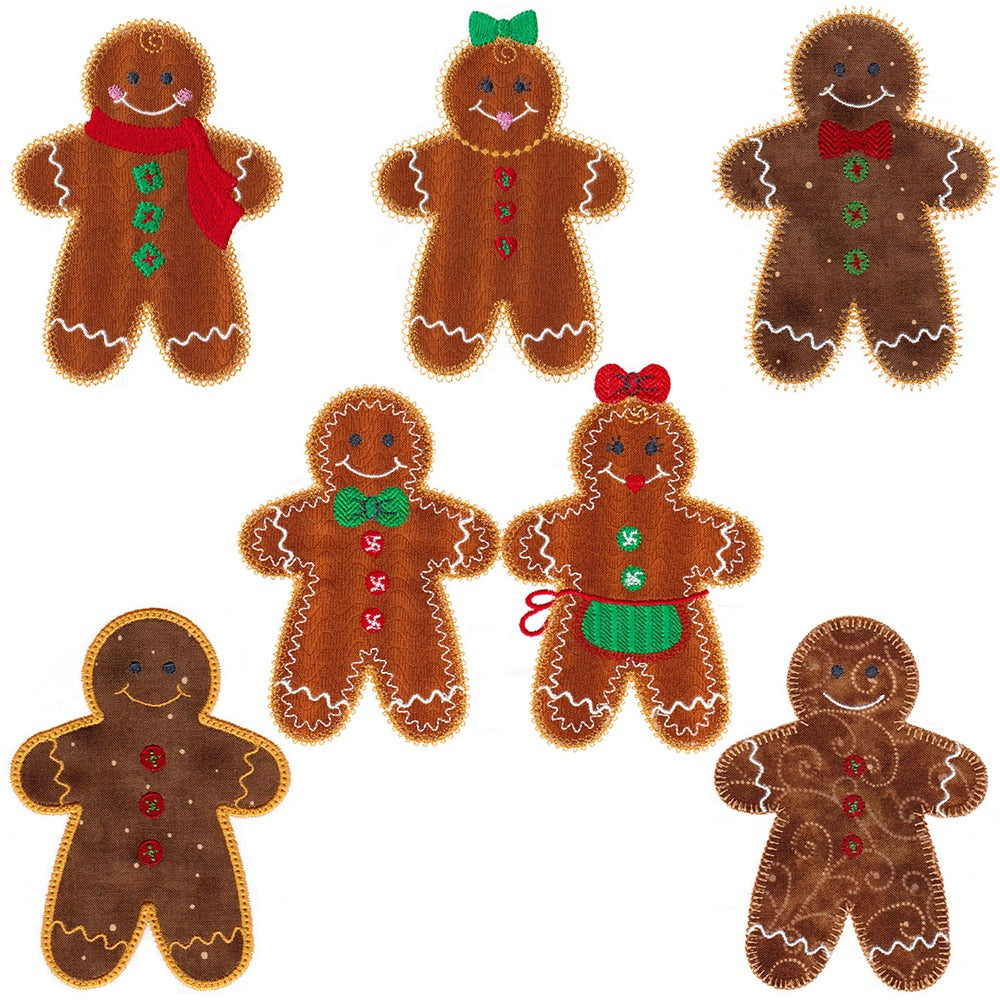 6 designs included in this set. 5 individual cookies and a design with two gingerbread cookies. The designs have a variety of applique edges and embellishments.