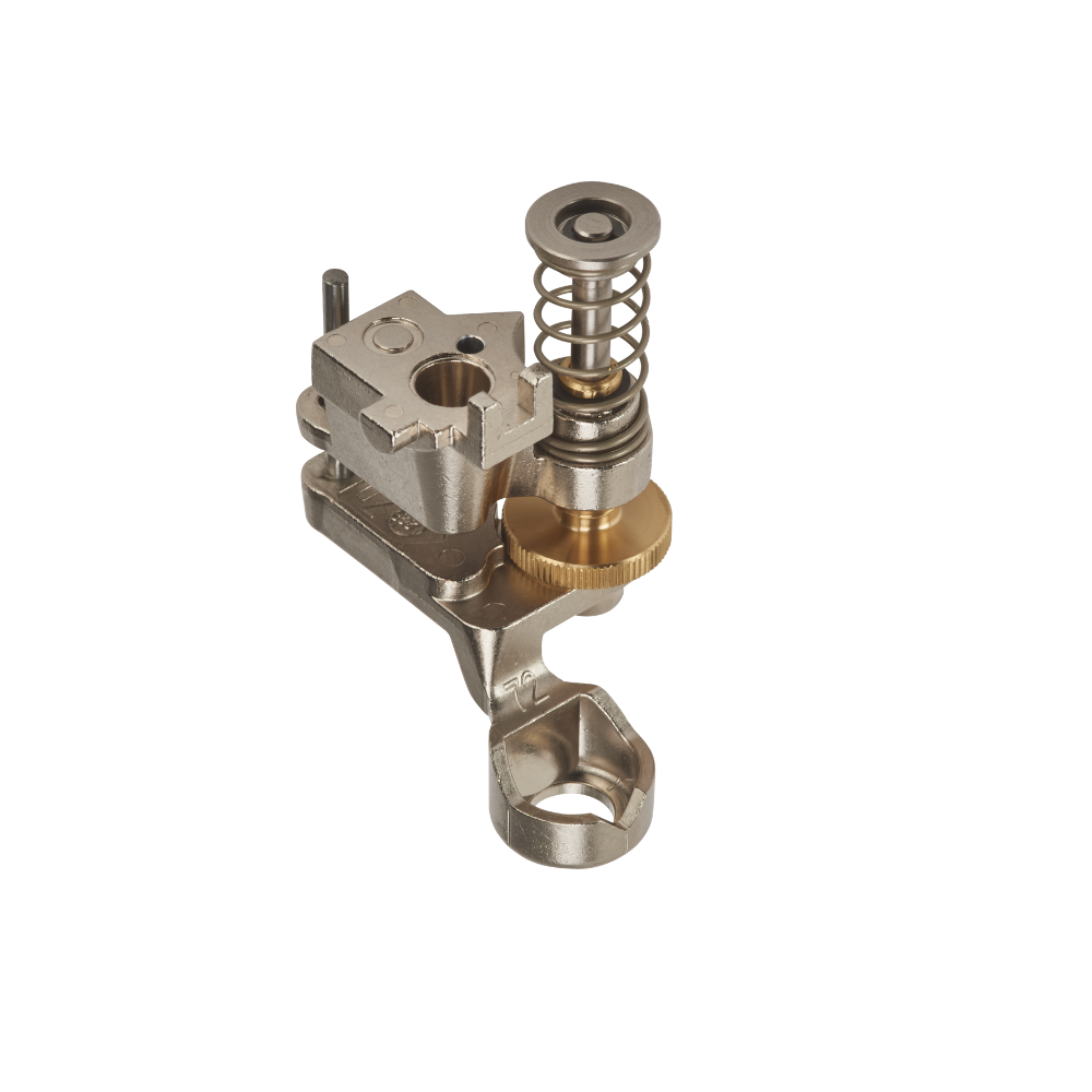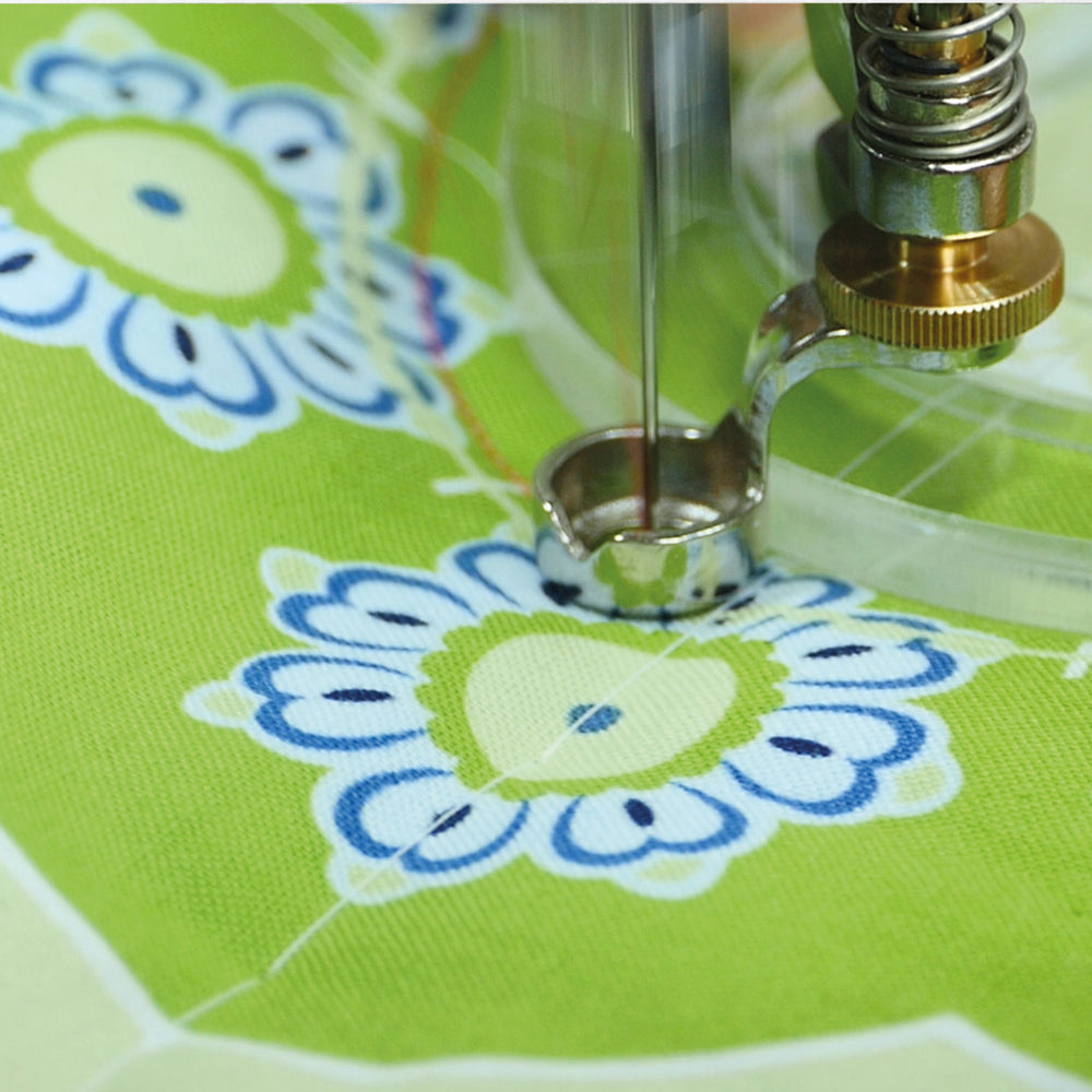 With this technique, the feed dog is lowered, and the fabric with the Plexiglas ruler is guided manually with the base of the foot resting against the edge of the ruler. Due to the adjustment dial, you can adjust the height of the foot to match the fabric thickness individually so that the fabric can be moved smoothly and without getting stuck.