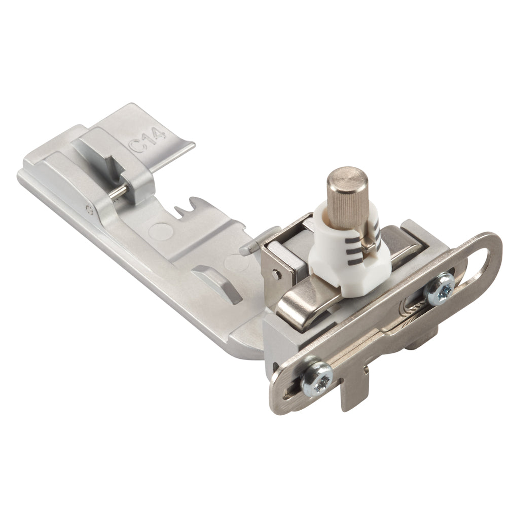 The Elasticator foot guides and stretches the elastic as it is being sewn on. Ideal for lingerie, swimwear, sportswear, and home textiles. With markings for both left and right needles and adjustments for stretch, position and width of the elastic; Suitable for elastic between 5mm and 20mm.