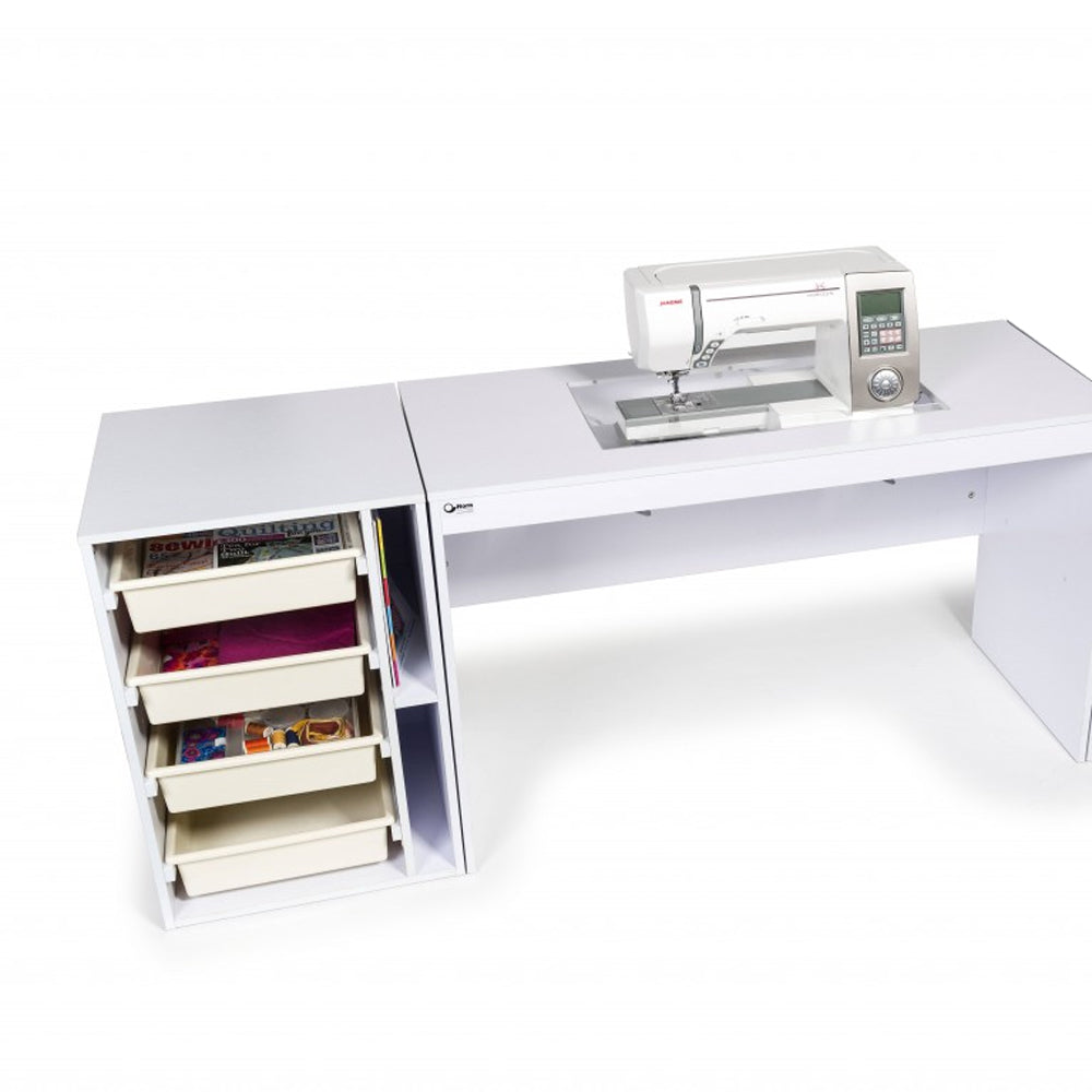 <p><strong>Horn Elements Sewing Table Unit</strong><br>Fitted with our maxi aperture/ opening giving it the ability to fit even the largest domestic sewing machines but the small and simple foot print makes it ideal for smaller spaces.&nbsp;<br>Like our Sewers Vision the Elements table (Model 201) is fitted with a 2- position manual mechanism platform which allows either a flatbed or free-arm sewing position. Each position can be reached by using a quick release adjustment lever. To get the most out of the flatbed position you can purchase a separate flatbed inset which can be cut to fit your particular brand and model of sewing machine.<br>&nbsp;</p><p><strong>Horn Elements Sewing Table Unit</strong></p><p>Four plastic storage drawers that are are easily removable for access just like those found in the Maxi Hobby Table (Model 101), a side storage shelf that we find perfect for machine sewtables &nbsp;and books.<br>Elements are delivered in an easy to assemble form for courier delivery, like our other tables delivery and set up can be arranged but this would incur additional costs. &nbsp;</p>