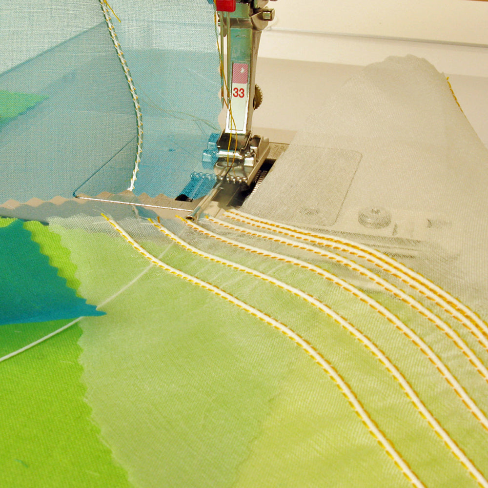 Pintuck foot with 9 grooves #33 is especially suitable for lightweight fabrics such as batiste. When sewing pintucks, it is used with a double-needle.