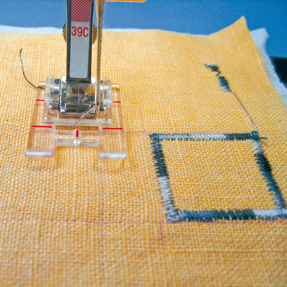 Embroidery foot with clear sole #39 is an extremely versatile tool. This presser foot is outstanding for compact decorative stitch patterns, satin stitching, and appliqué, as well as for sewing off-the-edge scallops.