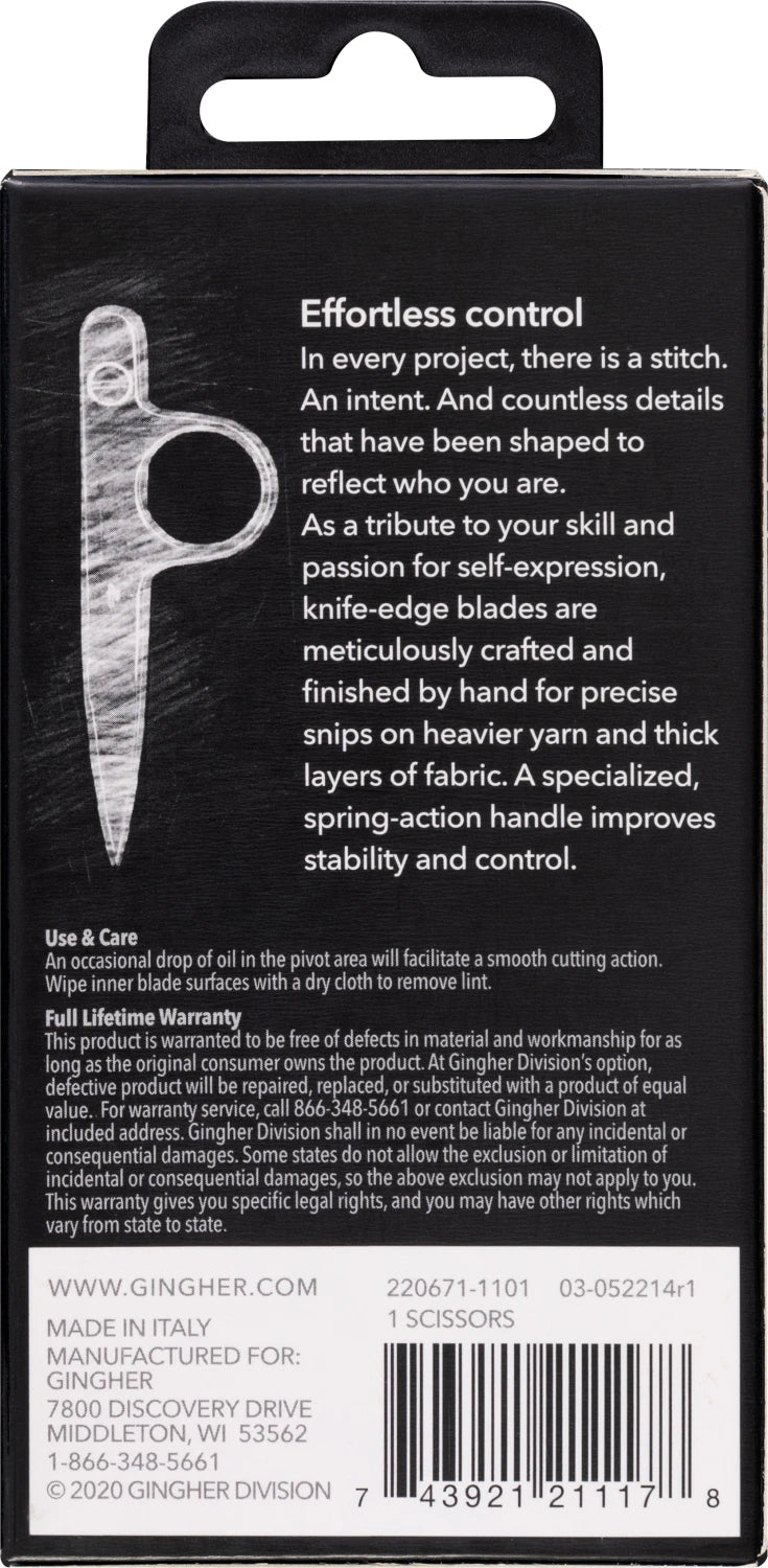 The Gingher 4½" Spring Action Knife Edge Thread Nipper reflects the craftsmanship and considered design for which Gingher is renowned. Long regarded as an aspirational brand among sewists, Gingher tools are chosen not only for their performance but also for the satisfaction and confidence they bring to every project.
