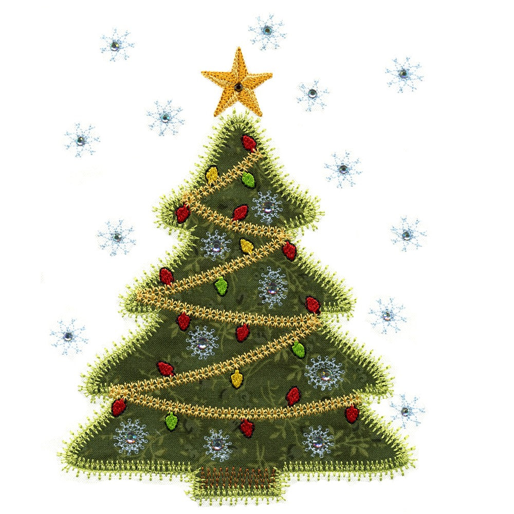 We’ve taken the tree and created a single design. Add some sparkle to the tree with rhinestones. Applique edges created using decorative motif stitches.