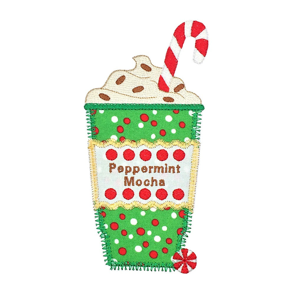 A peppermint mocha to go. This design was created using a variety of decorative motif applique edges and fun embellishments.