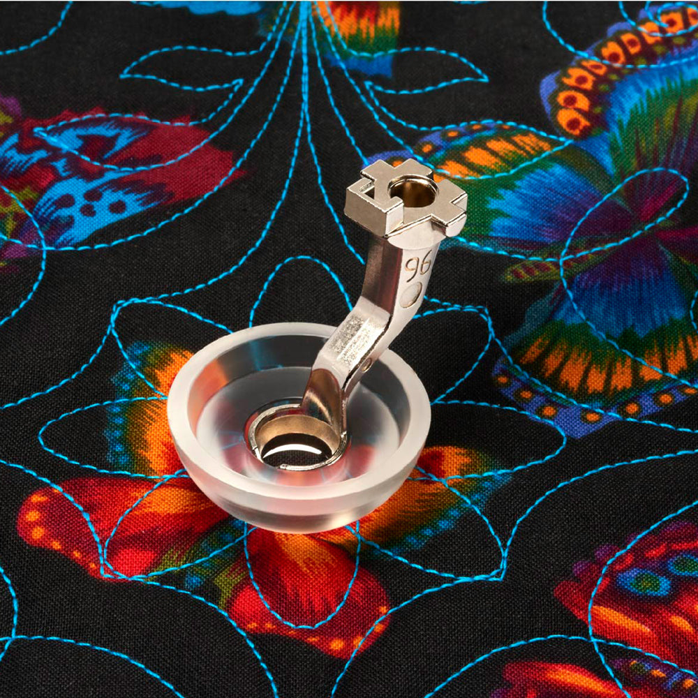 High edged clear perspex clip to attach to your Bernina ruler foot 96V. Glide over the edges of appliqué or off the edge (on a frame) and back on over the batting and top without hitches. With concentric markings and crosshairs for precise alignment with the needle for perfect penetration points.