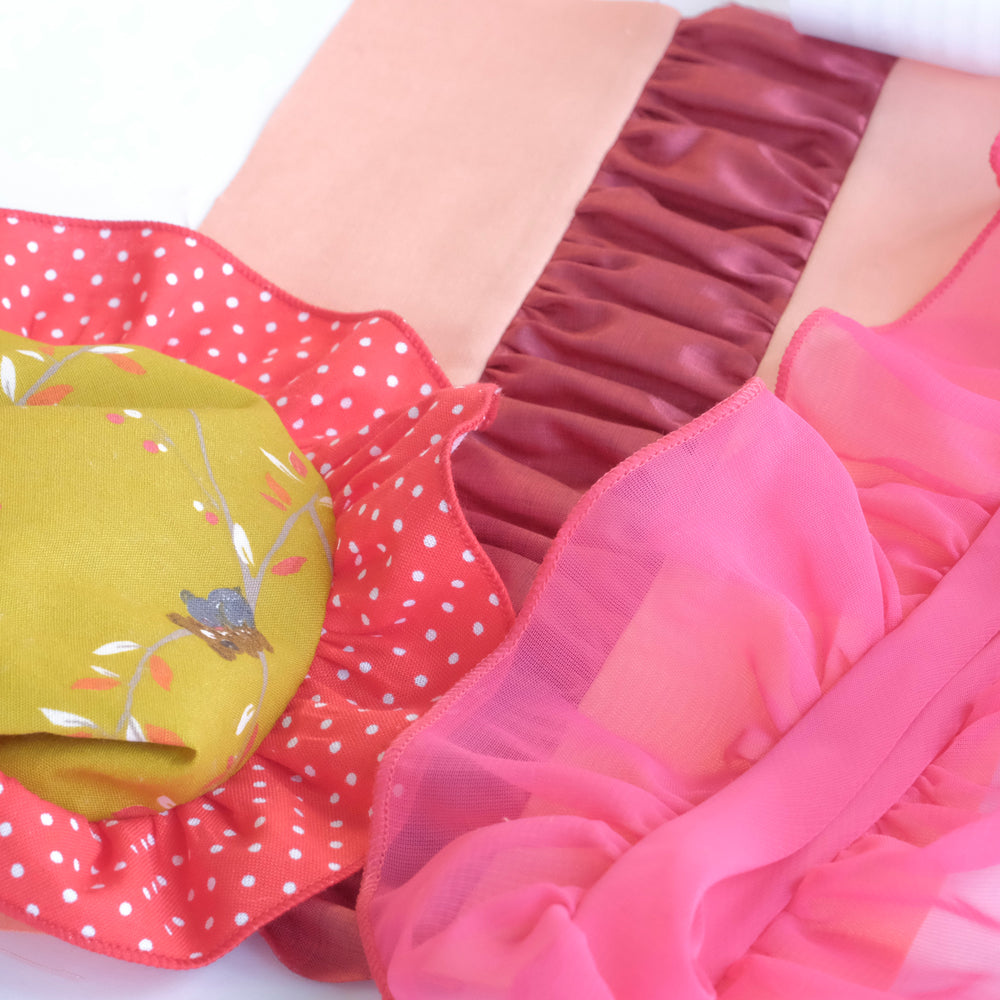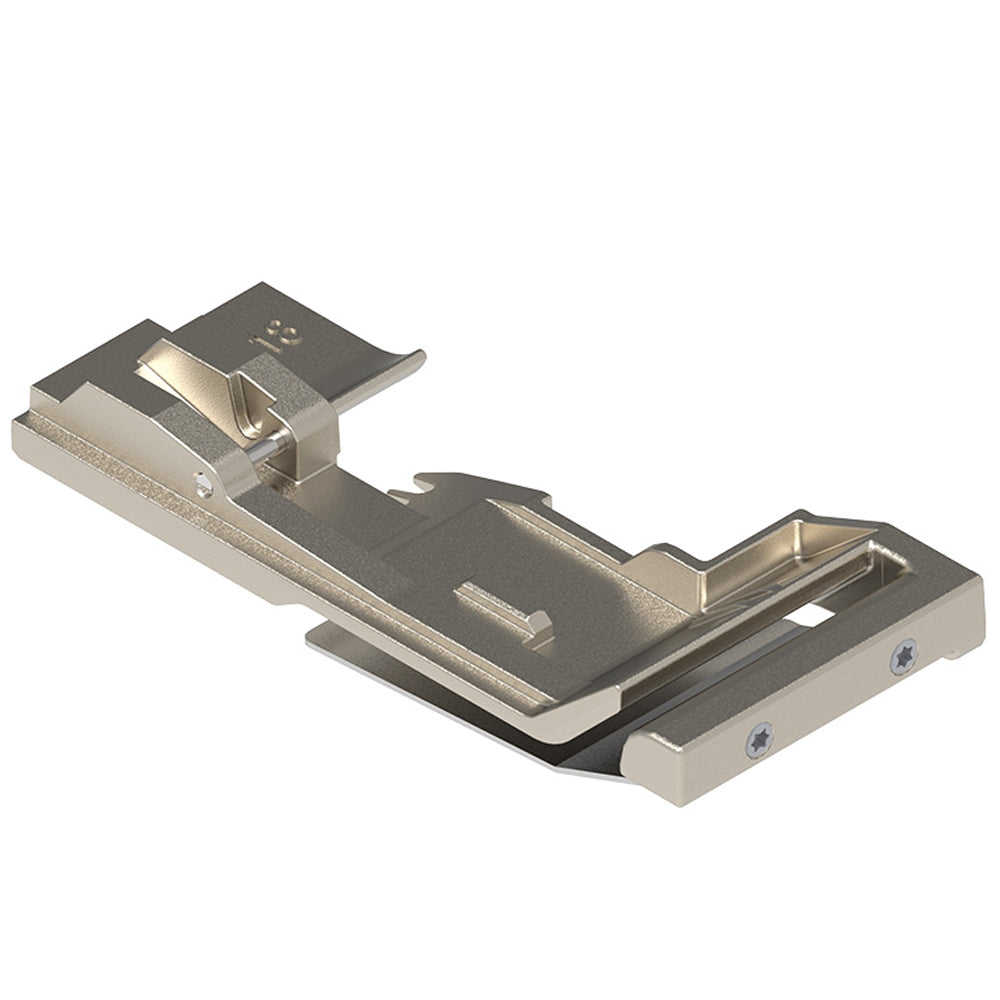 The overlocker can gather fabric by changing the differential feed when stitching the fabric. The advantage of the Gathering foot is simultaneous attaching of a second flat fabric while you gather. With markings for both left and right needles and a cutting mark to ensure you have all the guidance you need.