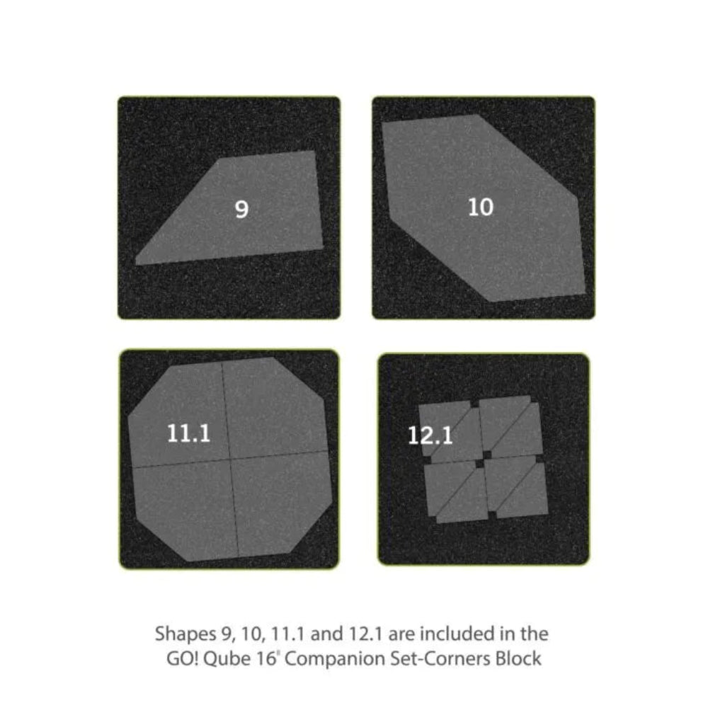 This set is all about corners, including four shapes labeled 9-12.1 - a continuation of the 1-8 die numbering system from the GO! Qube Mix & Match 16" Finished Block with a cutting mat and pattern booklet.