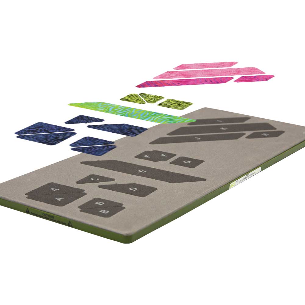 Lotus Block is a Block on Board® (BOB®) die, which means it's specially designed to cut a 5-colour, 10" block in one pass through the cutter. There are no templates or special rulers; Lotus Block includes 14 time-consuming shapes to cut by hand.