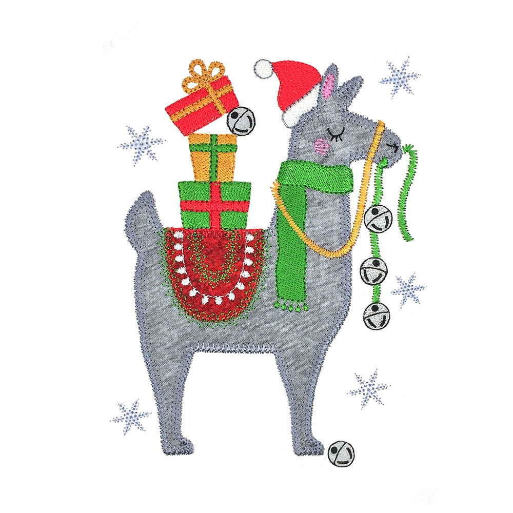 This llama comes bearing gifts. It was created using a variety of decorative motif applique edges and fun embellishments.