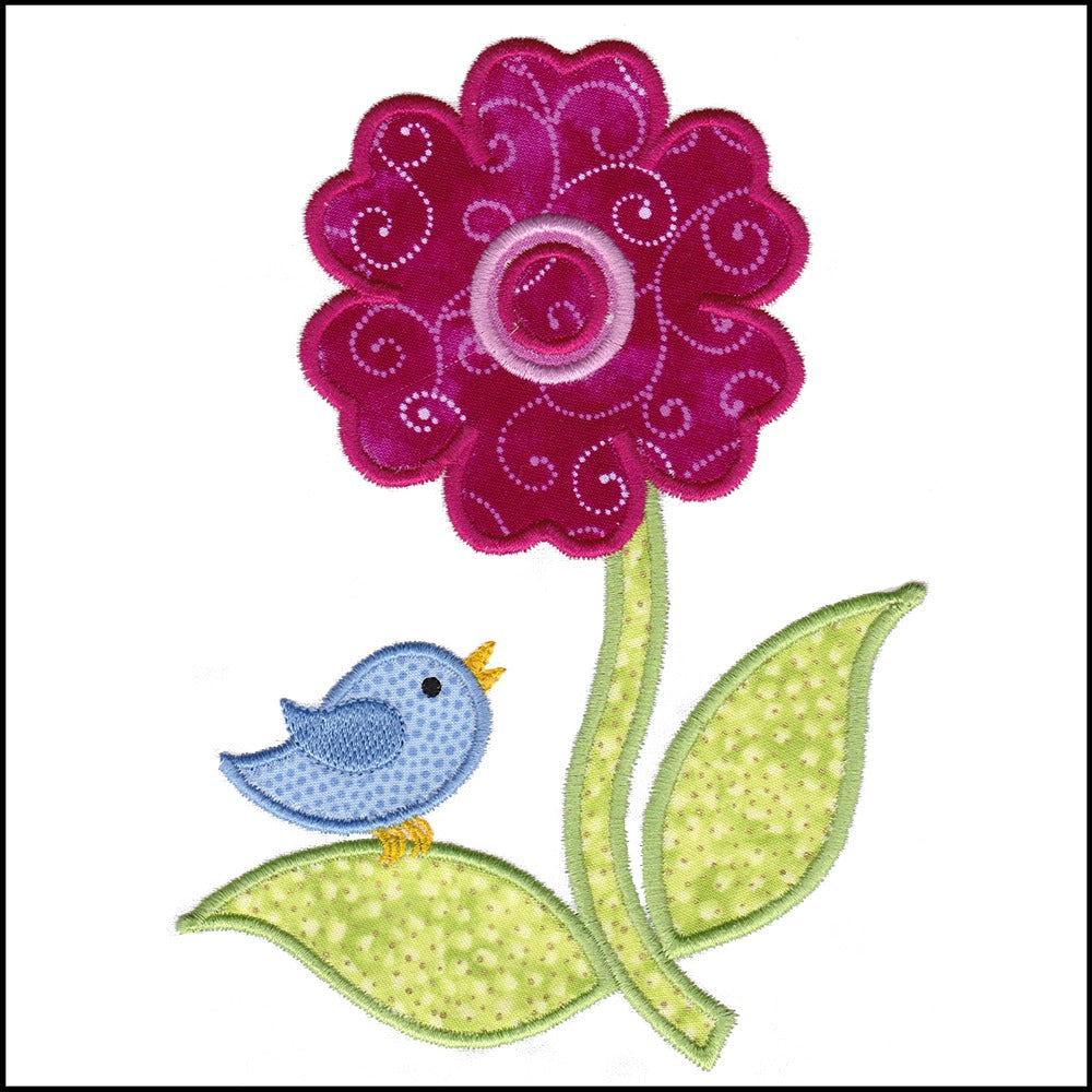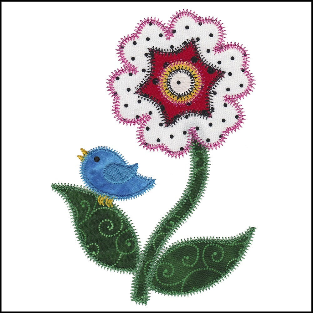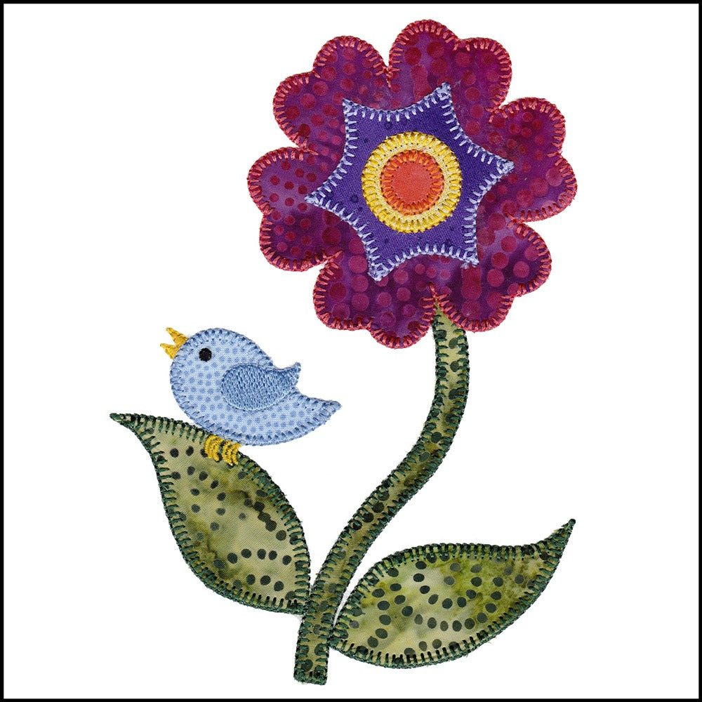 This machine appliqué design set is designed to be used with the AccuQuilt Go! Round Flower (55007) and Birds (55324) dies.