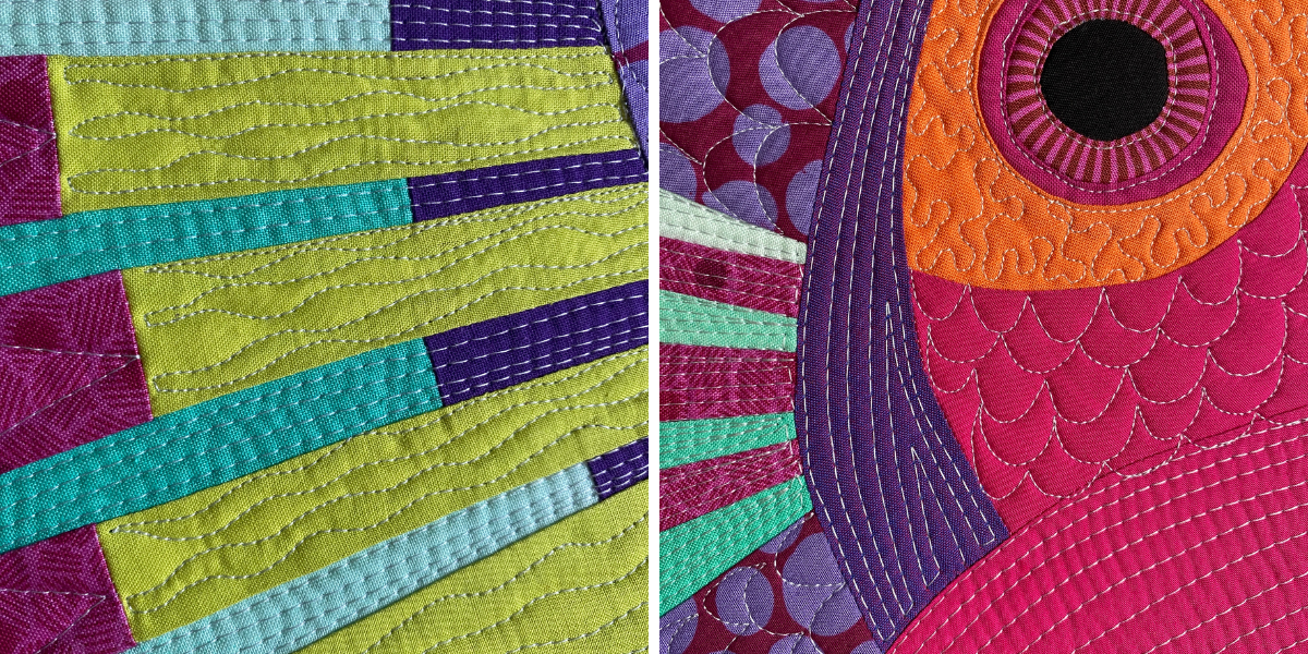 The majority of the retreat will focus on the four main improv piecing techniques used to create the Parrot Fish Quilt: inset circles, inserts, freehand curves, and slabs. These techniques are used to make up the main section of the fish, mainly the head, fins, body and tail.