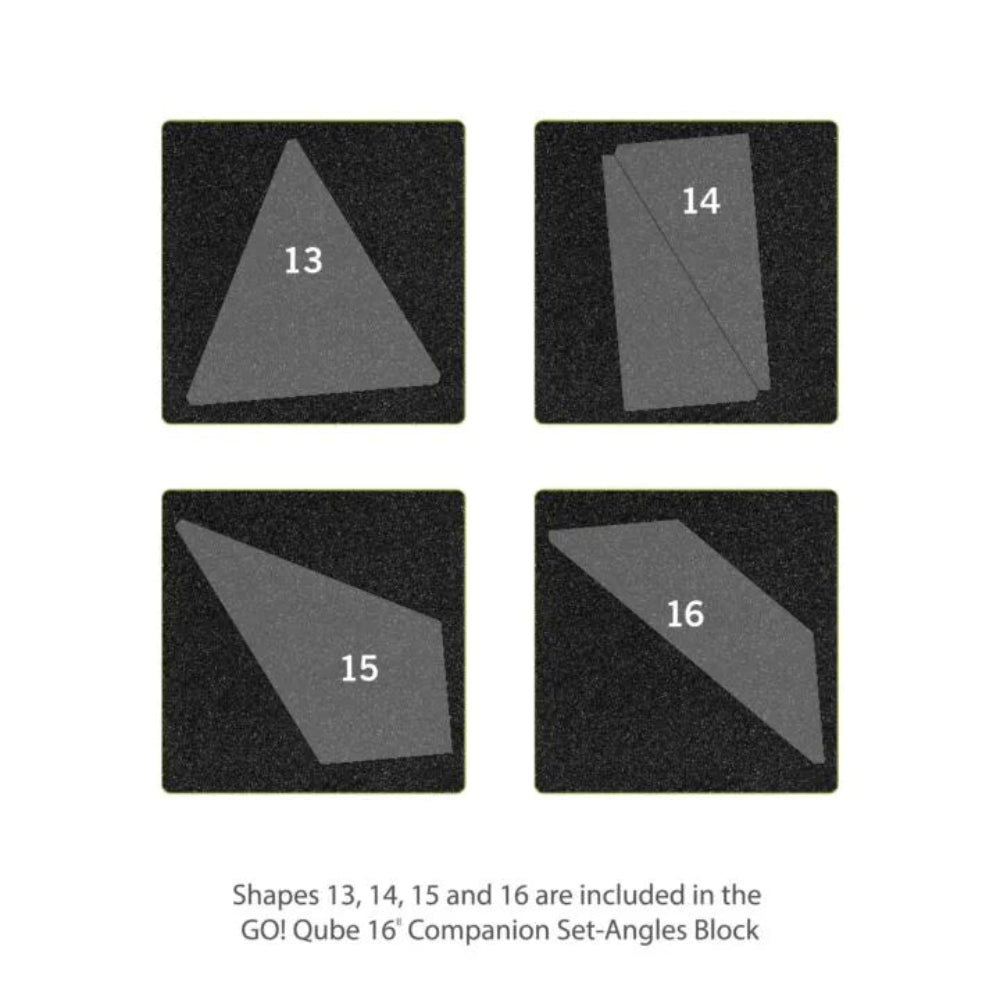 This set includes four angled shapes labeled 13-16 - a continuation of the die numbering system from the GO! Qube Mix & match 16" Finished Block and GO! Qube 16" Companion Set-Corners, with a cutting mat and pattern booklet.
