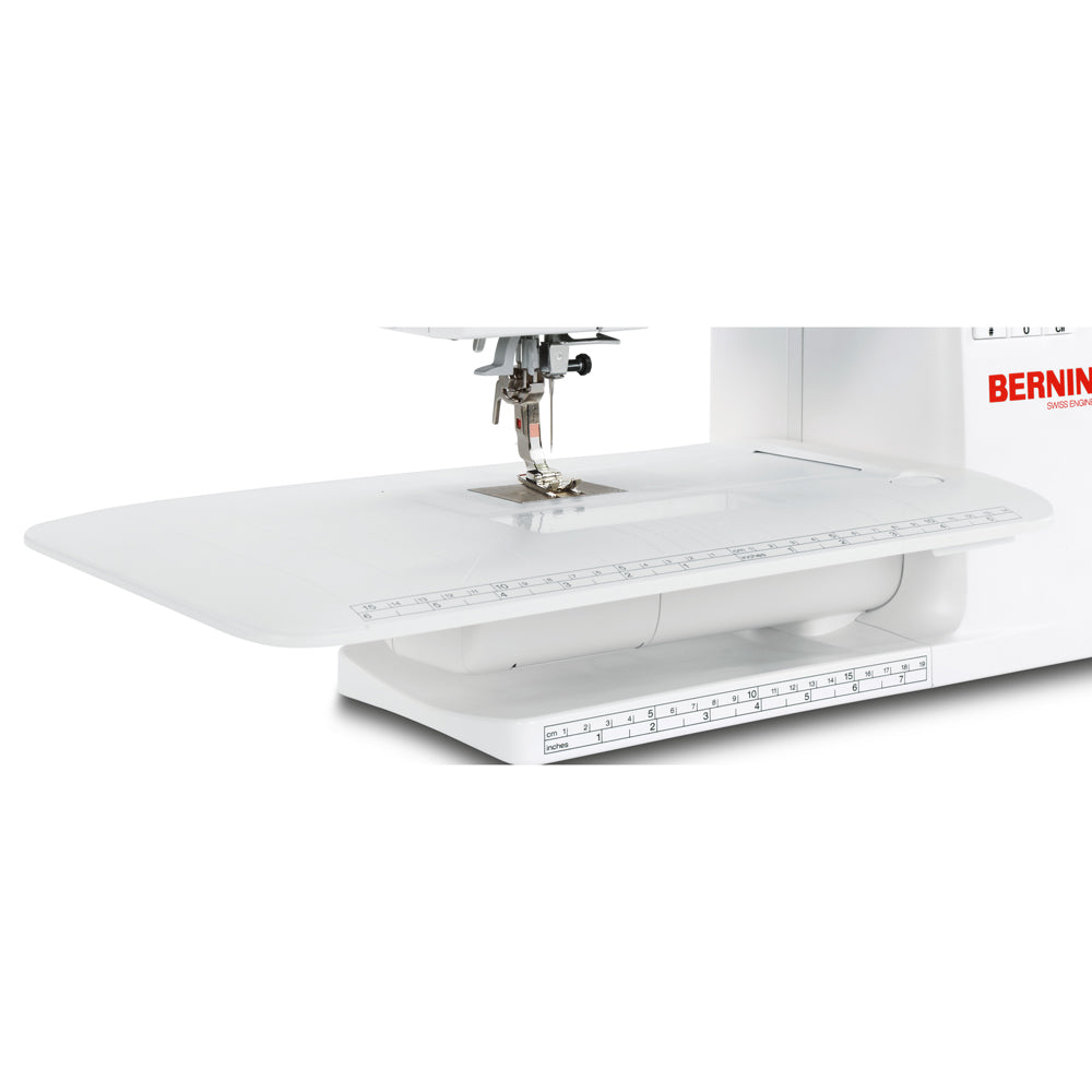 The Bernina extension table offers a whole range of advantages for comfortable and precise sewing. Attached to the free arm, it increases the existing workspace. At the same time, its special shape ensures that free-arm functionality remains available, and that fabric feeds smoothly during sewing.