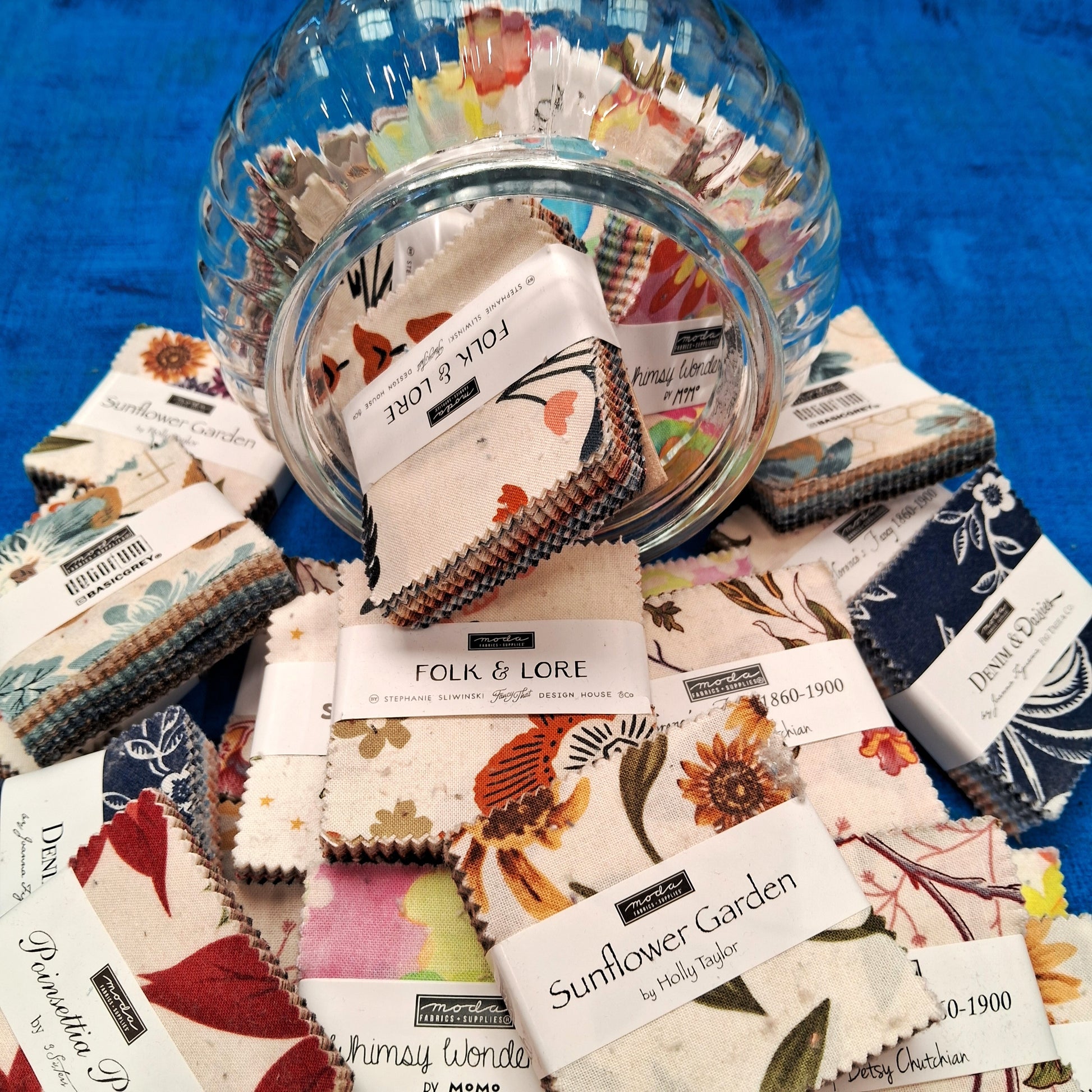 Order this Mystery Pack and receive 5 randomly-chosen Mini Charm Squares from the Moda Designer Collections, for just £25.