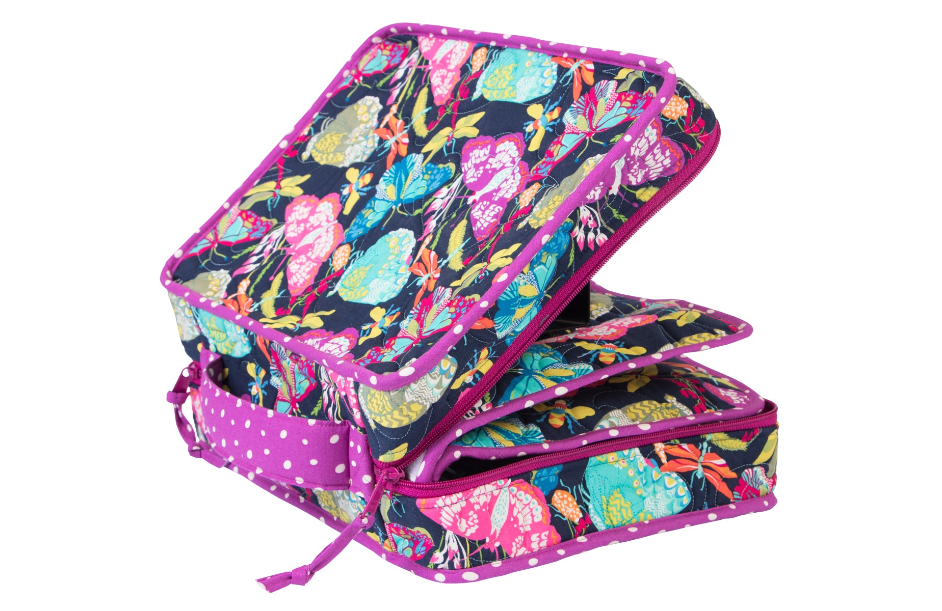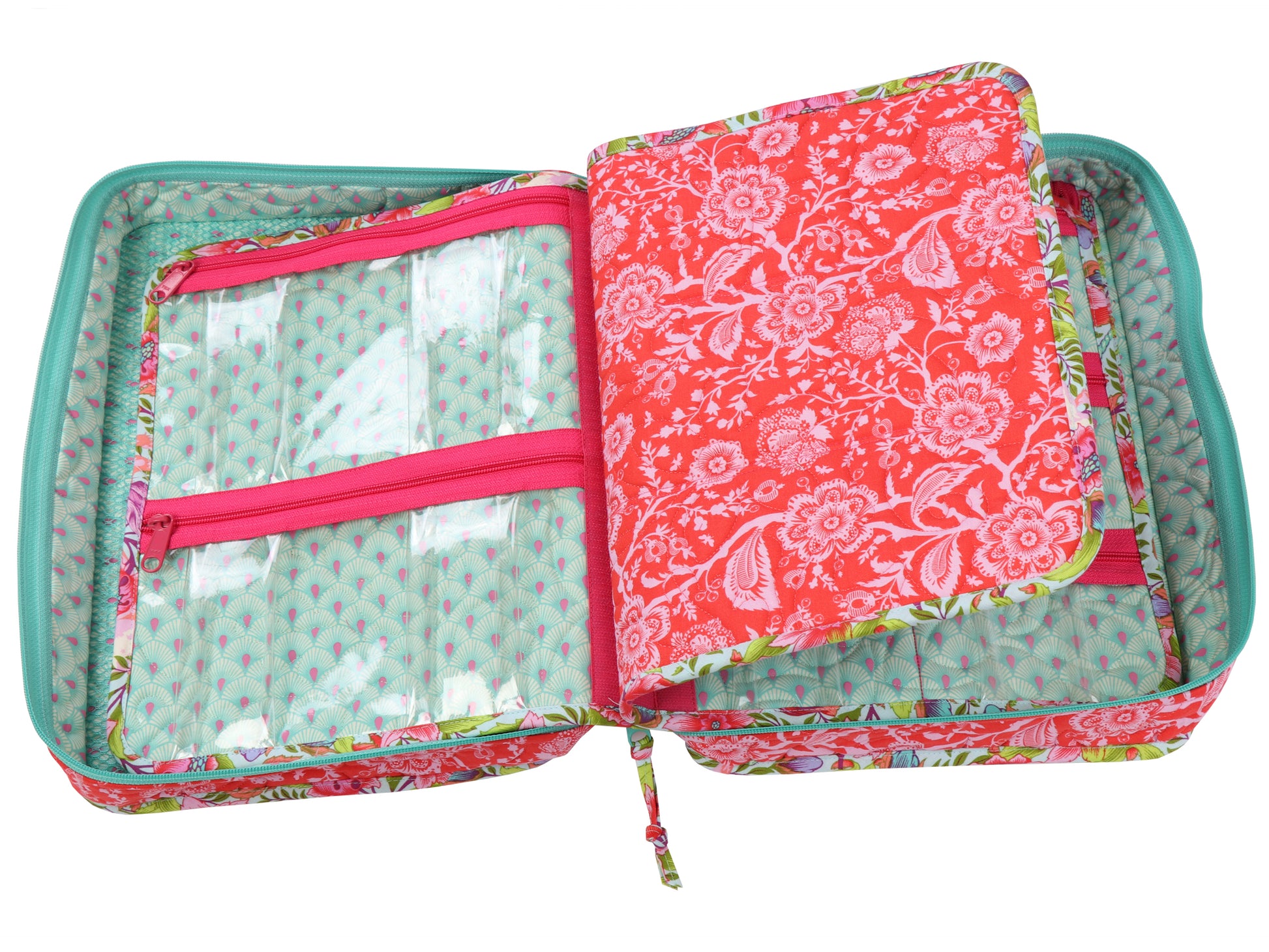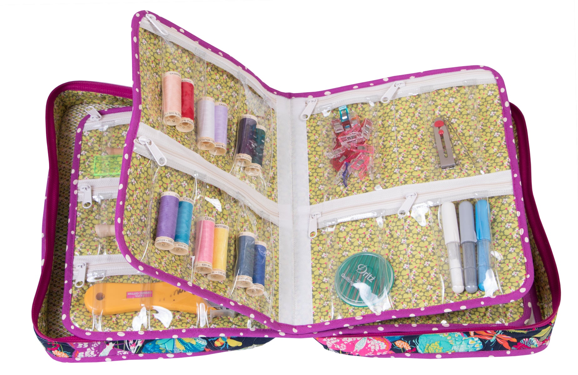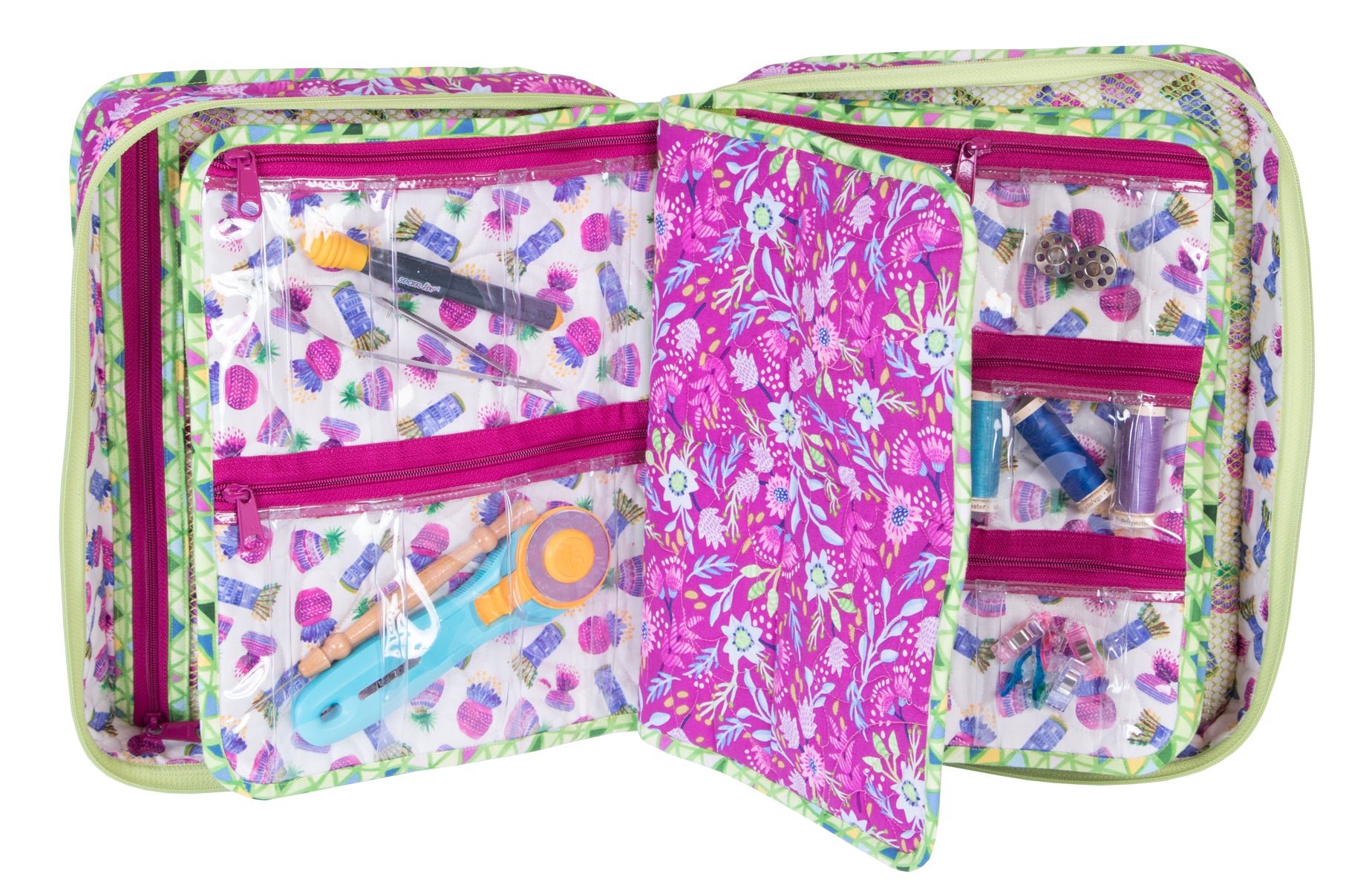 You'll love this spacious organizer with lots of zippered pockets to hold everything you need - sewing machine feet and accessories, tools, and more. The case features a handle at the top for easy carrying. A double-slide zipper closure provides safe, secure storage and easy access to all your supplies. Removable pocket pages with pocket arrangements in four styles feature zippered pockets to hold all your supplies, electronic gear, or other treasures. The clear vinyl pockets provide an easy view of everything in the bag. Mesh pockets inside the front and back of the case provide storage space for a 9" x 12" cutting mat or ruler, book, or other items.
