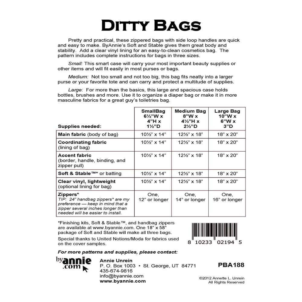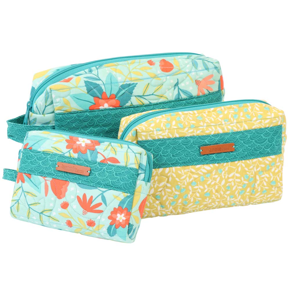 Pretty and practical, these zippered bags with side loop handles are quick and easy to make. ByAnnie’s Soft and Stable gives them great body and stability. Add a clear vinyl lining for an easy-to-clean cosmetics bag. The pattern includes complete instructions for bags in three sizes.