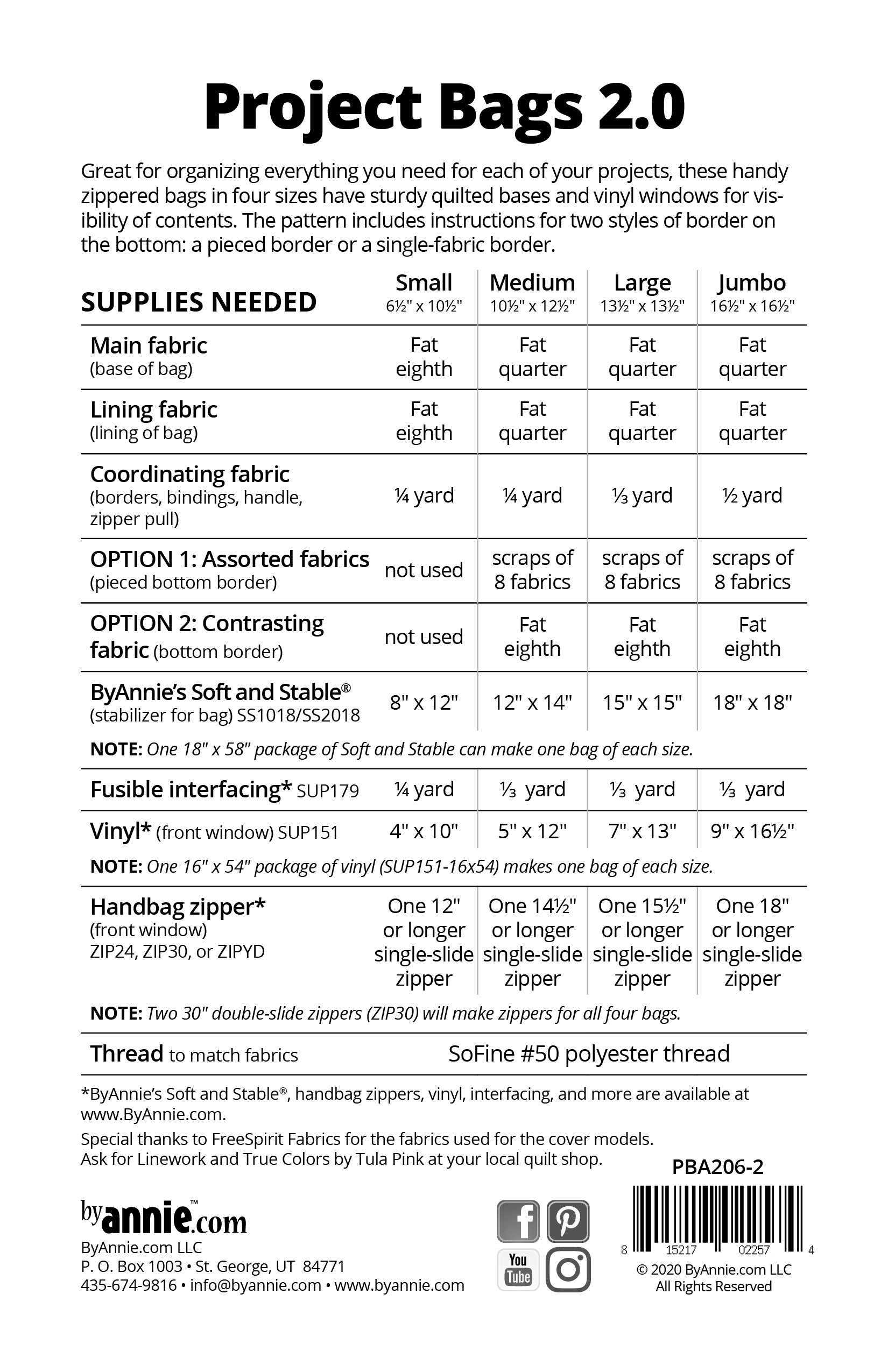 These handy zippered bags have sturdy quilted bases and vinyl windows for visibility of contents. A handle at the top may be used for carrying or hanging. The medium, large, and jumbo bags also have colorful borders at the bottom. These borders may be pieced or may feature a single fabric. Hold and organize everything from sewing supplies to puzzles, games and more in these sturdy bags.