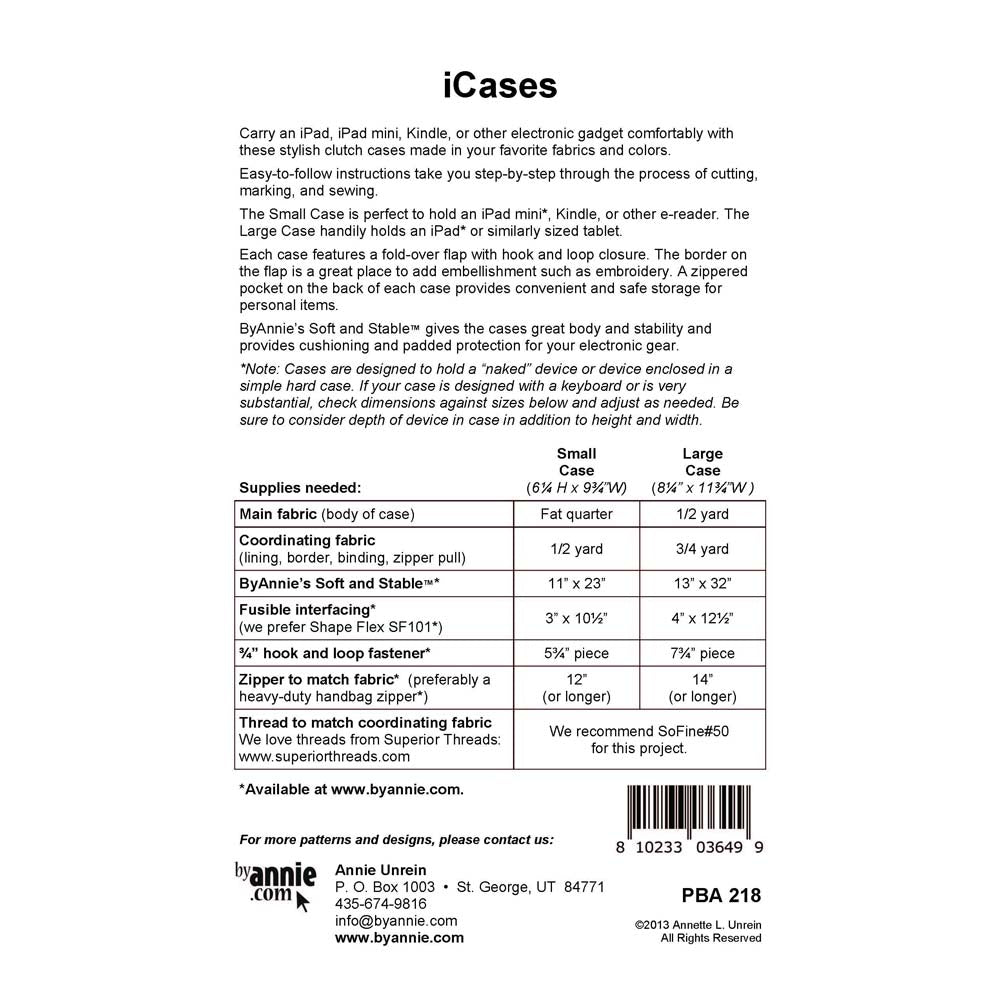 Carry an iPad, iPad mini, Kindle, or another electronic gadget comfortably with these stylish clutch cases in your favourite fabrics and colours. Easy-to-follow instructions take you step-by-step through the process of cutting, marking, and sewing. The Small Case is perfect for holding an iPad mini*, Kindle, or other e-readers. The Large Case handily has an iPad* or similarly-sized tablet. Each case features a fold-over flap with hook and loop closure. The border on the flap is a great place to add embellishment such as embroidery. A zippered pocket on the back of each case provides convenient and safe storage for personal items.