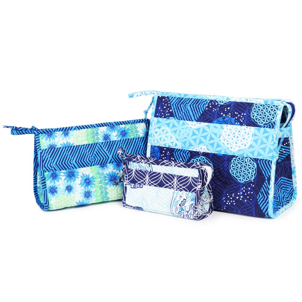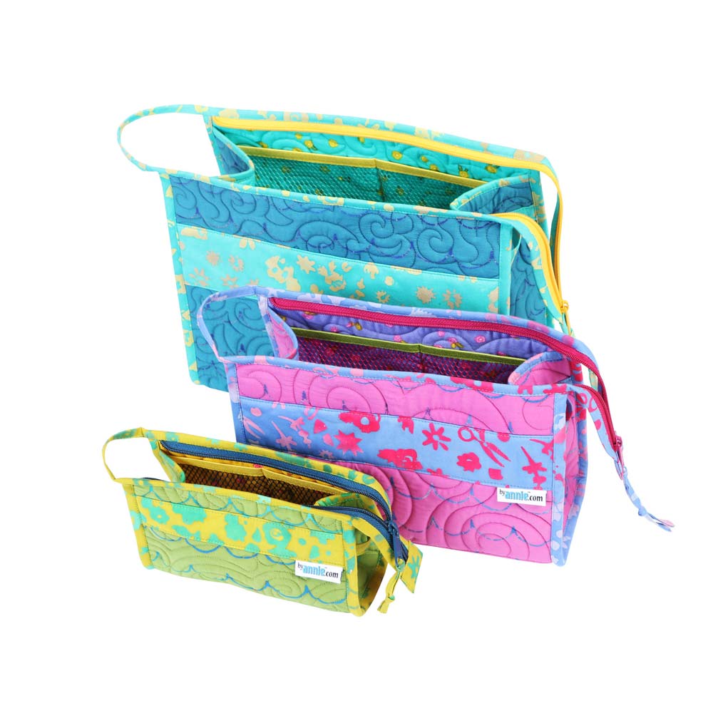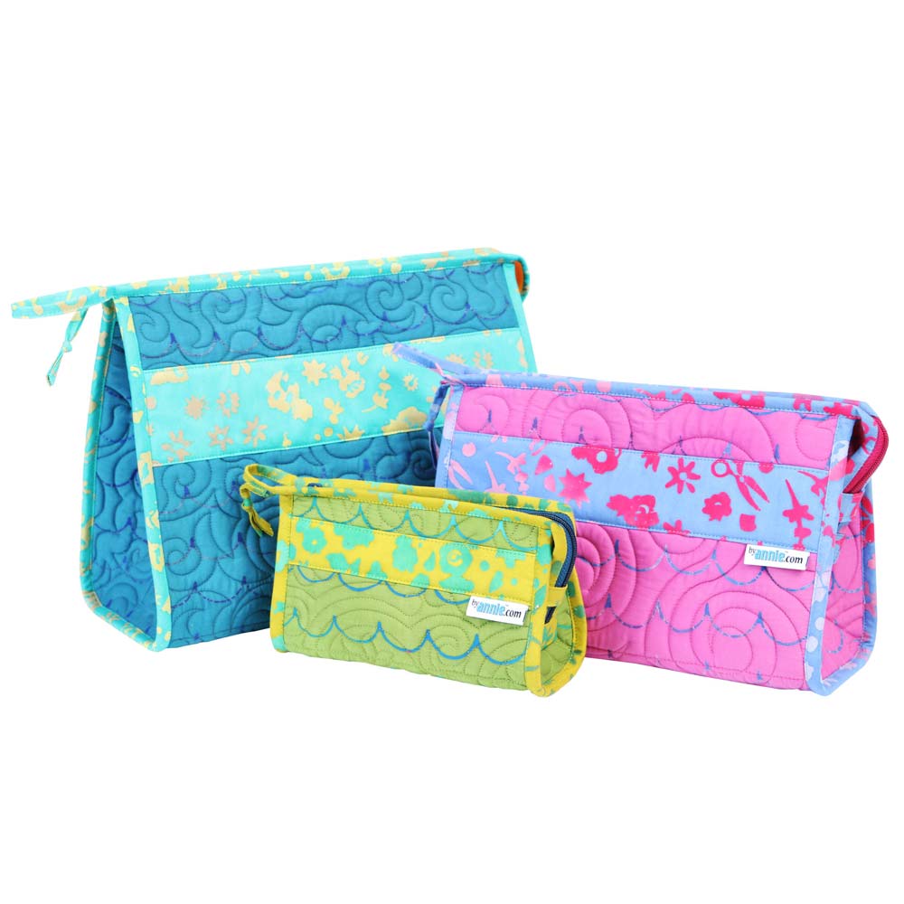Quick and fun to make, these bags in three sizes open wide for easy access to all your supplies. Binding on the easy-to-install zipper finishes the upper edges and forms a handle and grab tab. Two inner mesh pockets keep things organized and easy to view.