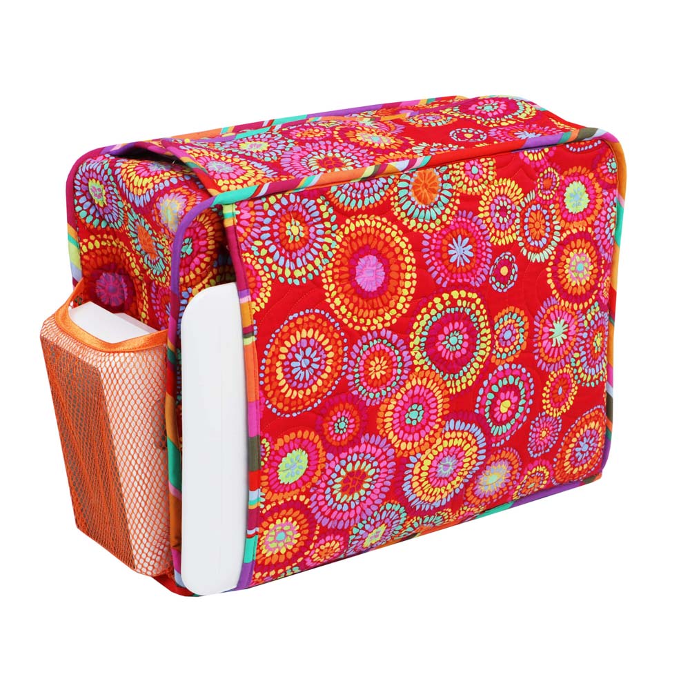 Each cover features slip pockets on the front and back, a zippered pocket on the left, and a mesh slip pocket on the right. There is an opening at the top for easy access to the sewing machine handle. Flaps with magnetic snaps cover the opening.