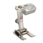 The wide opening at the front of the foot affords a clear view of the stitching area, while the wide wedge-shaped channel under the sole of the foot ensures perfect fabric feed even over dense stitch formations.