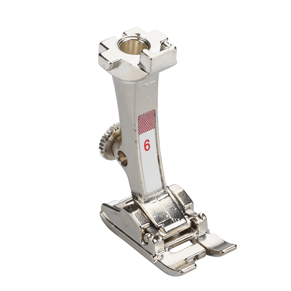 Embroidery foot #6 is ideal for satin stitching and other dense stitch patterns. The wide channel under the sole allows it to glide effortlessly over thicker and wider stitch formations without fabric feed being affected.