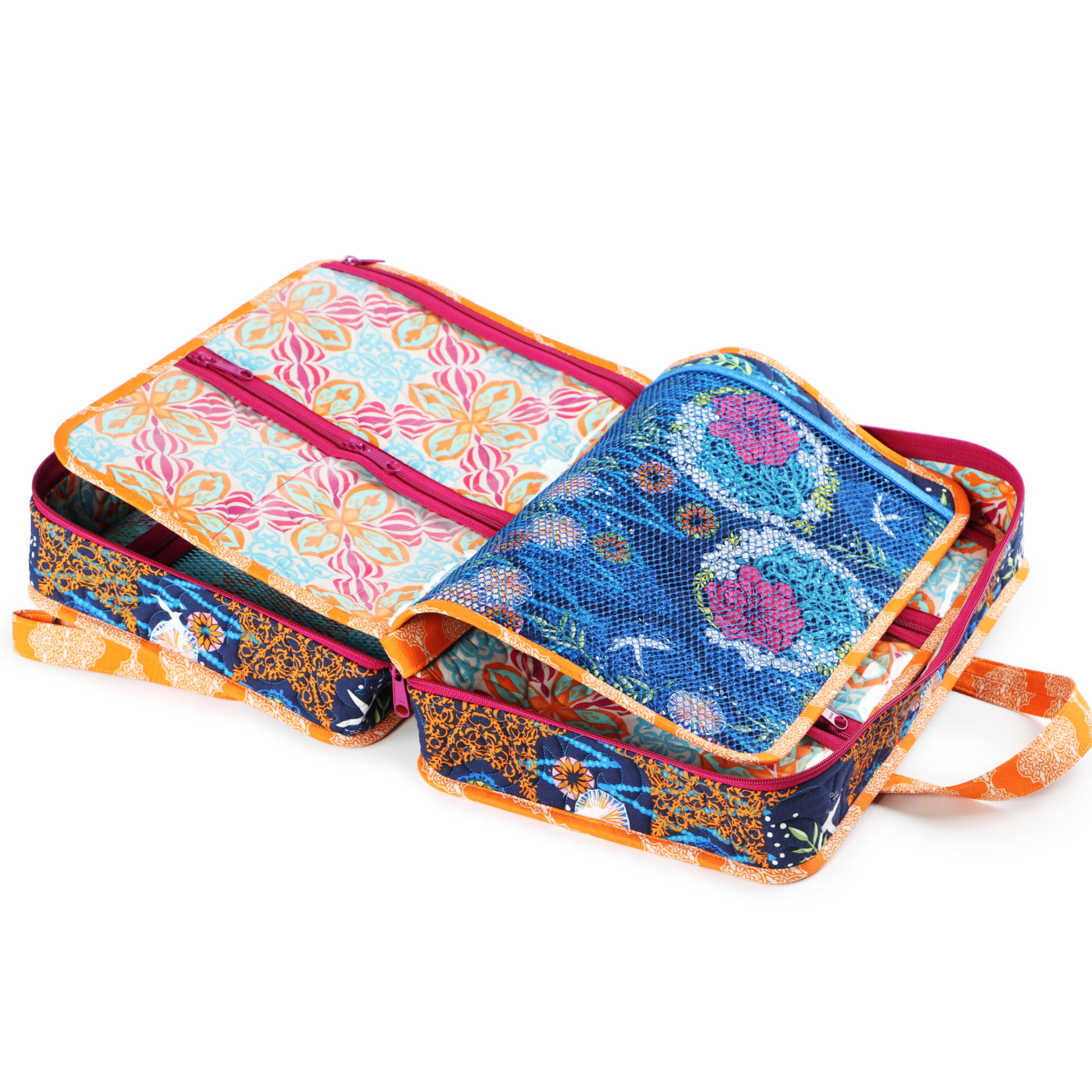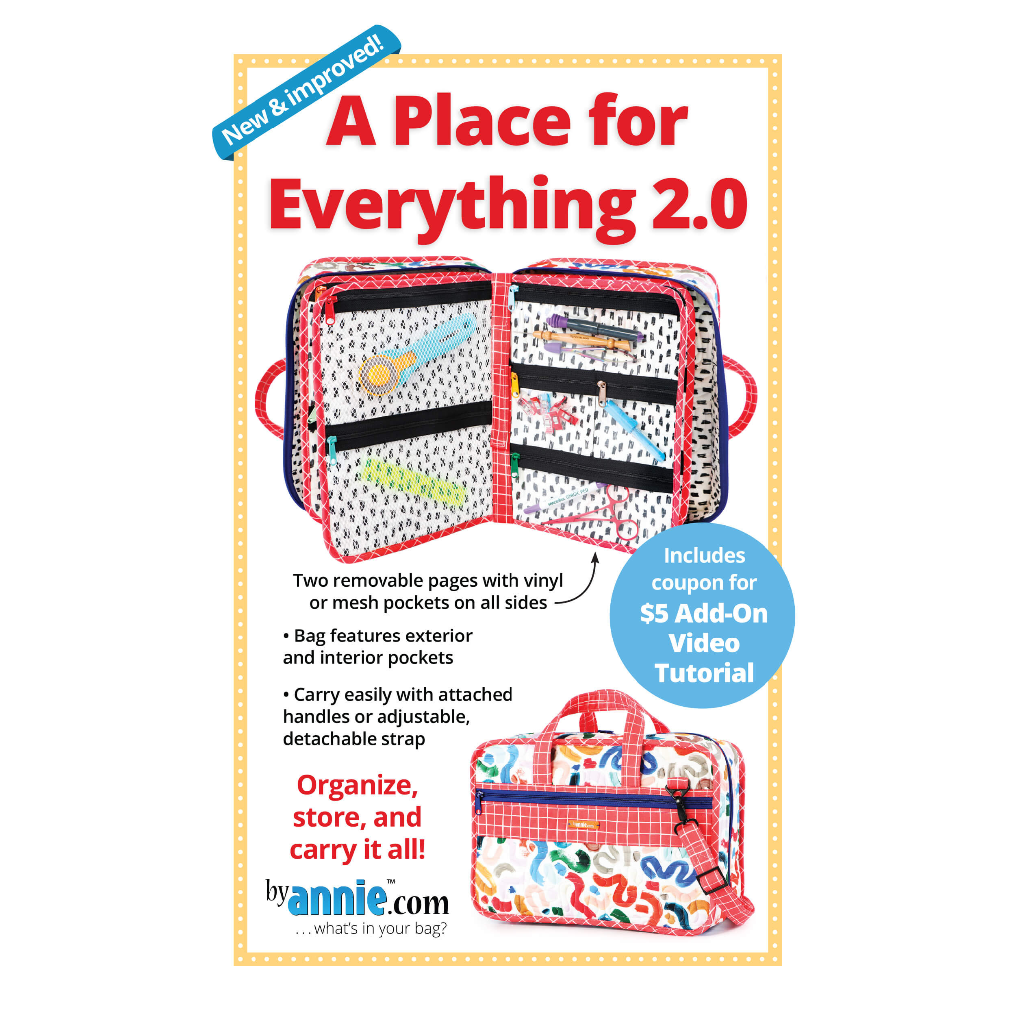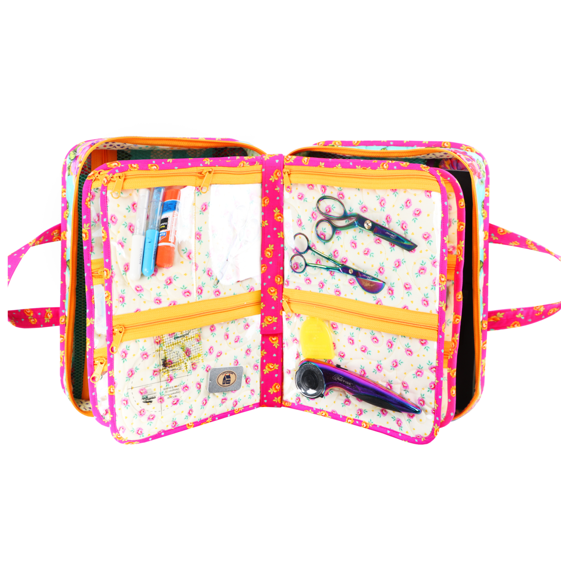 You'll love this spacious organizer with lots of zippered pockets to hold everything you need - sewing machine feet and accessories, tools, and more. The case features a handle at the top for easy carrying. A double-slide zipper closure provides safe, secure storage and easy access to all your supplies. Removable pocket pages with pocket arrangements in four styles feature zippered pockets to hold all your supplies, electronic gear, or other treasures. The clear vinyl pockets provide an easy view of everything in the bag. Mesh pockets inside the front and back of the case provide storage space for a 9" x 12" cutting mat or ruler, book, or other items.
