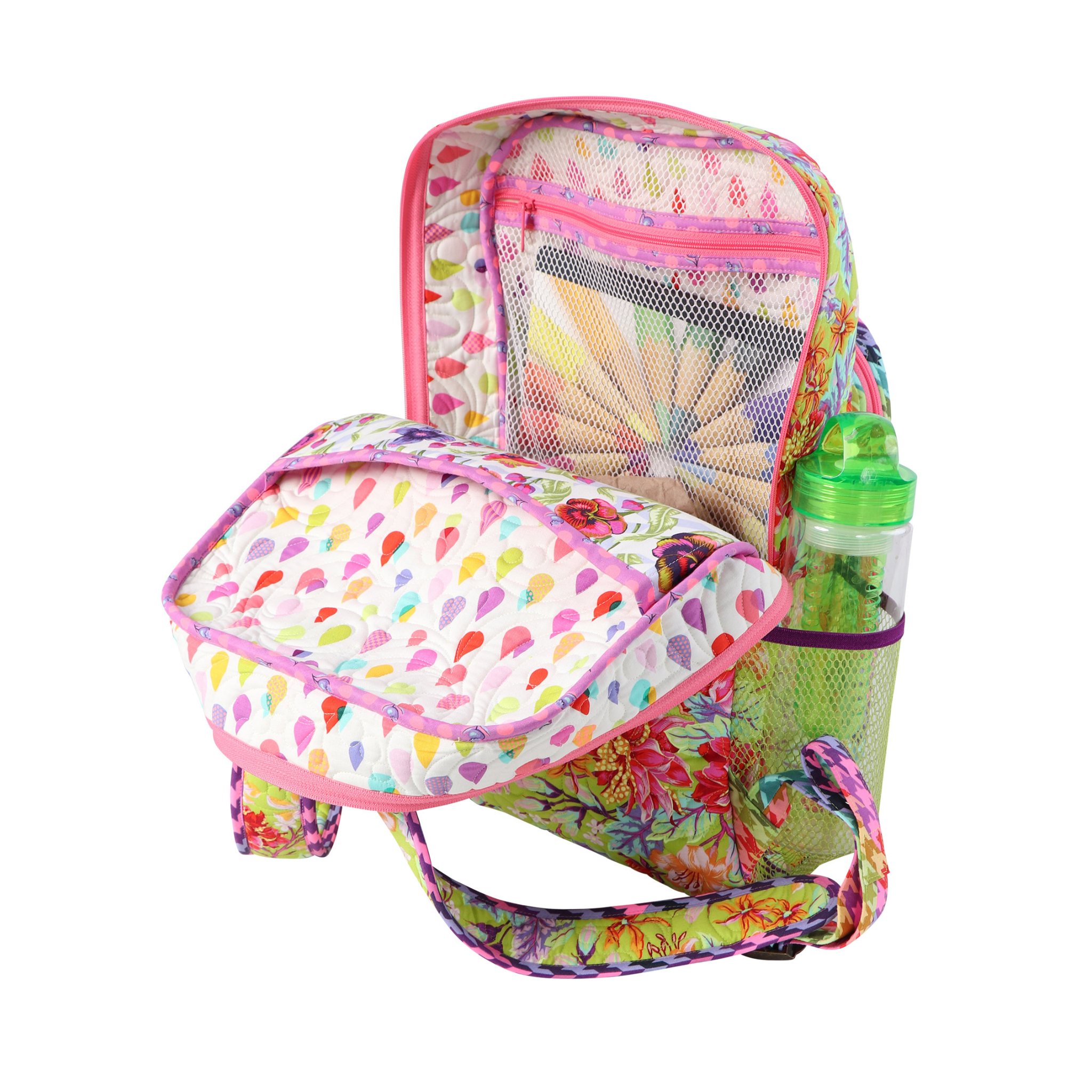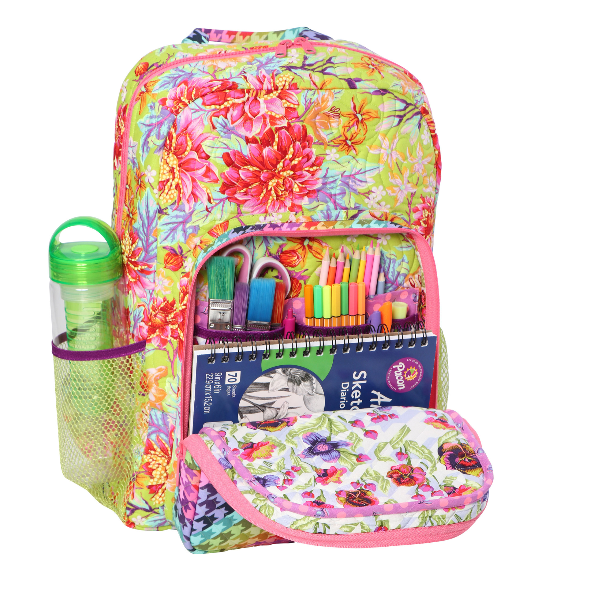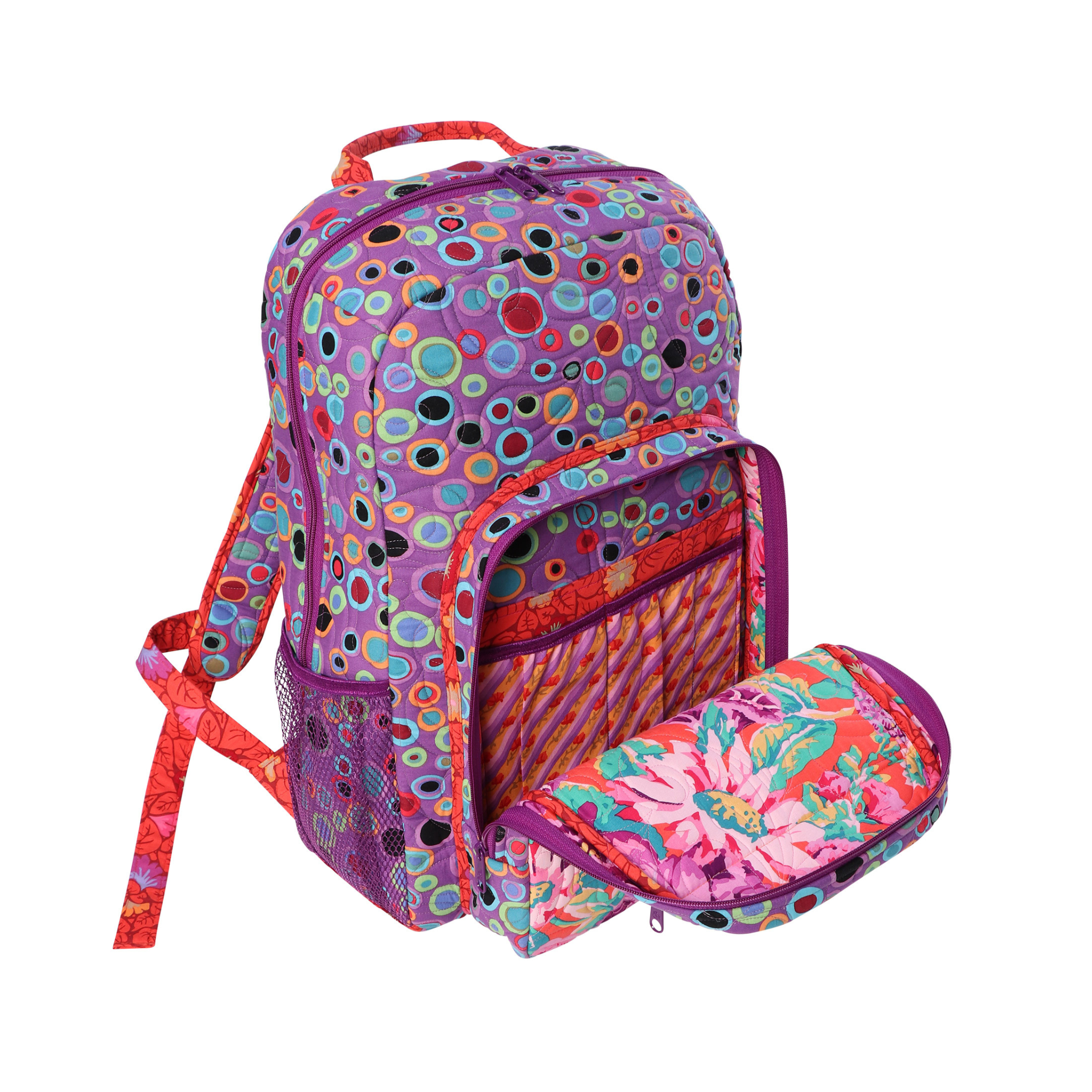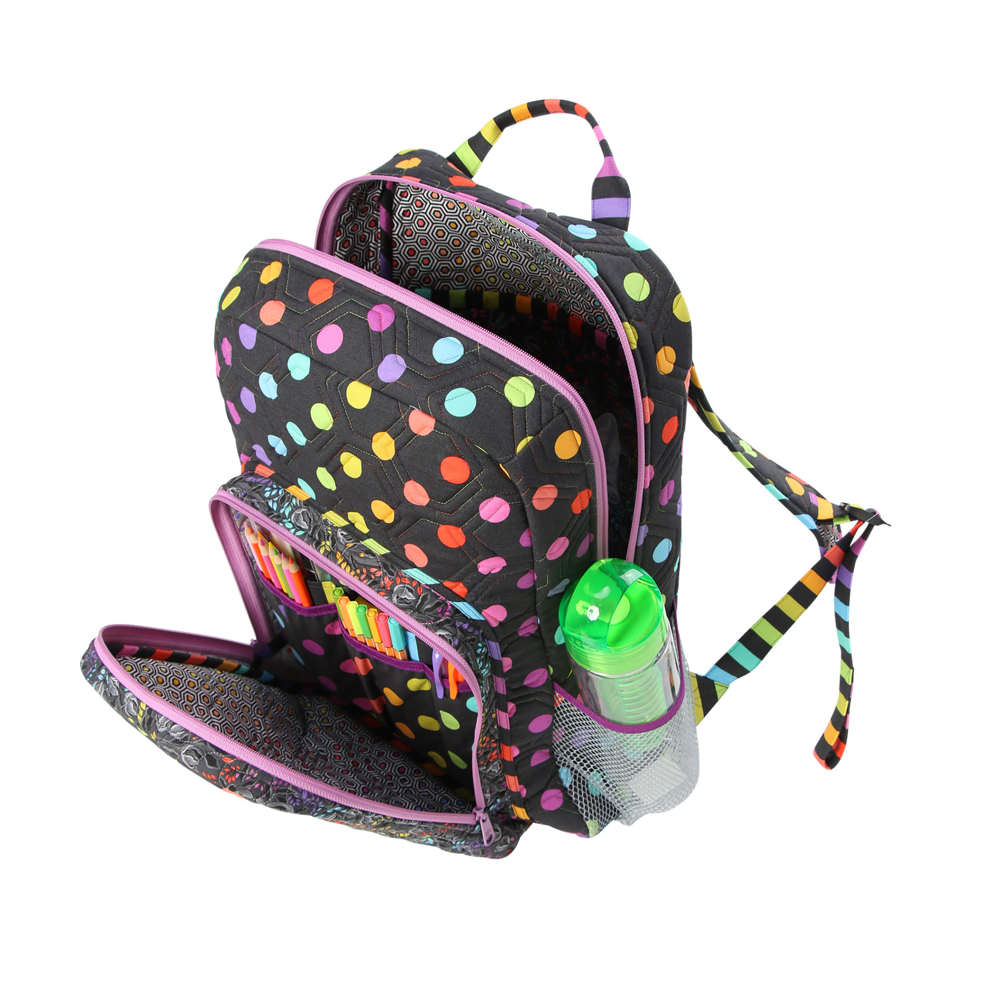 Features include multiple slip and zippered pockets, padded straps, a reinforced grab handle, and a padded sleeve to hold binders, books, or electronic devices.