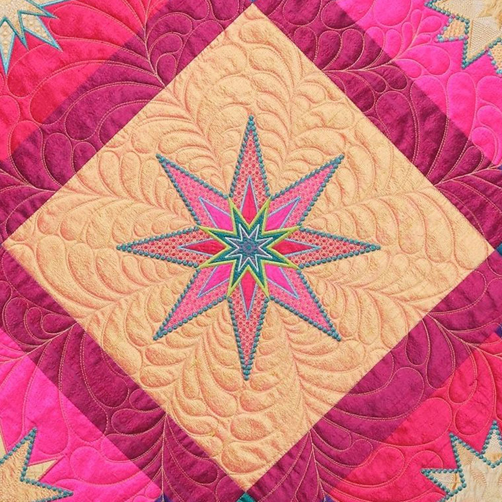 Note that due to hoop size limitations, not all designs are available in all formats. 6 small stars fit into a 3.5" diameter circle. 19 medium stars fit into a 5" diameter circle. 10 large stars fit into a 9" or 10" diameter circle. (5 of these have been split to allow them to be stitched out in a large hoop or Bernina mega hoop)