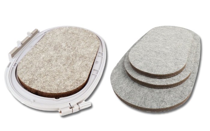The Hoop 'n Press Pads are a great double-sided pressing tool - designed to fit Bernina embroidery hoops. The 100% wool topped mats grip fabric for secure pressings, while also protecting the loftiness of your stitches. Use the ½" thick felted wool mat with or without steam to fuse appliqué from the back of the hoops, and even for in-the-hoop projects where pressing from the back is a must! The non-slip surfaces keep your hoops in place when you're piecing, taping, pinning, trimming and more.