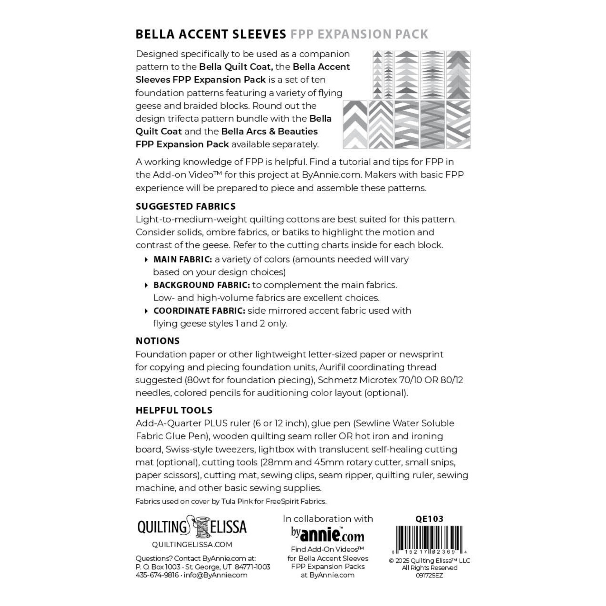 The Bella Accent Sleeves FPP (foundation paper piecing) Expansion Pack is designed specifically to be used as a companion pattern to the Bella Quilt Coat.