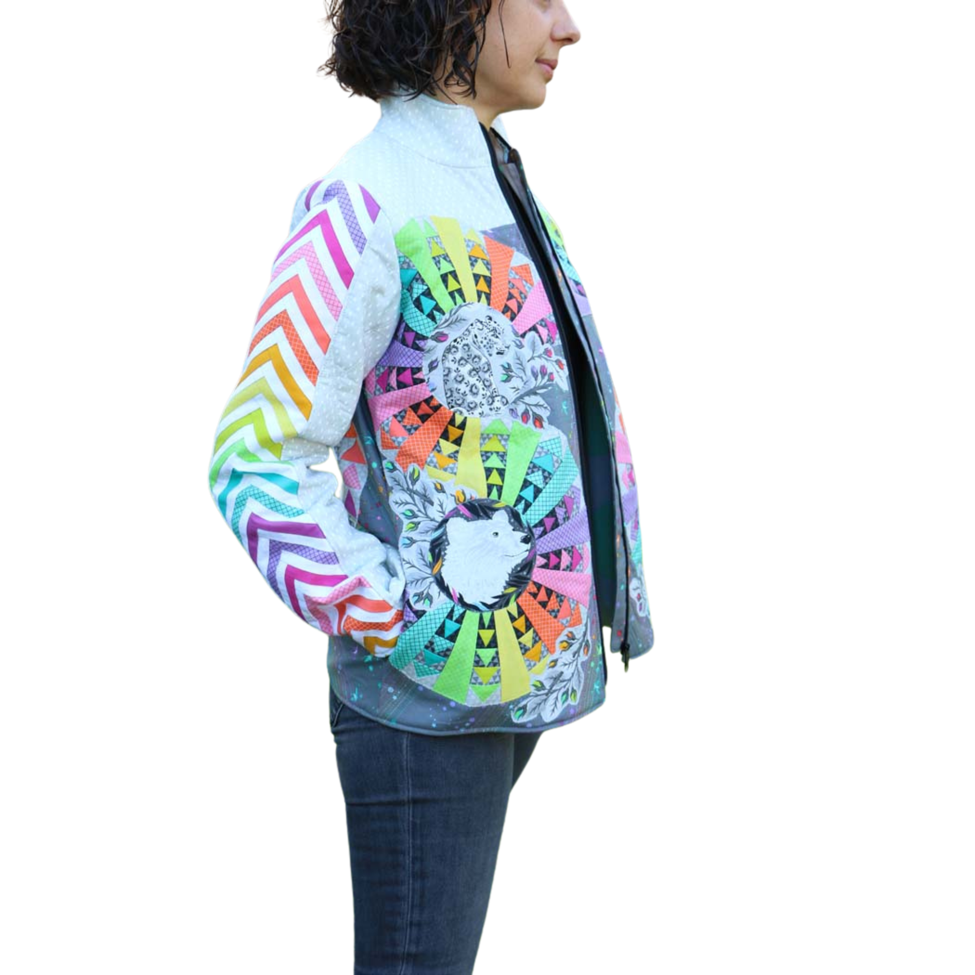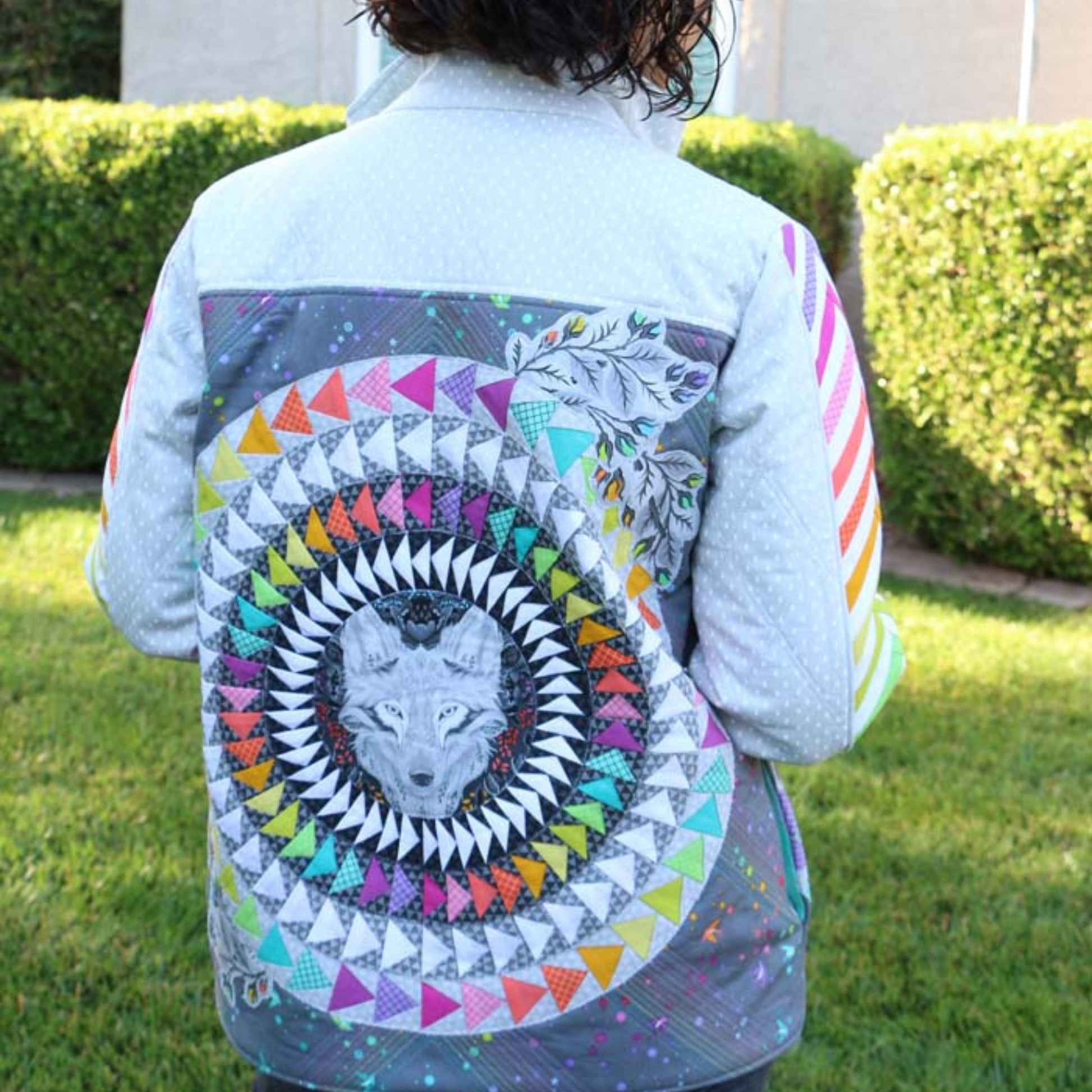Additionally, Flying Geese Beauties, in a smaller scale, geometrically mirror on each side of the coat front.