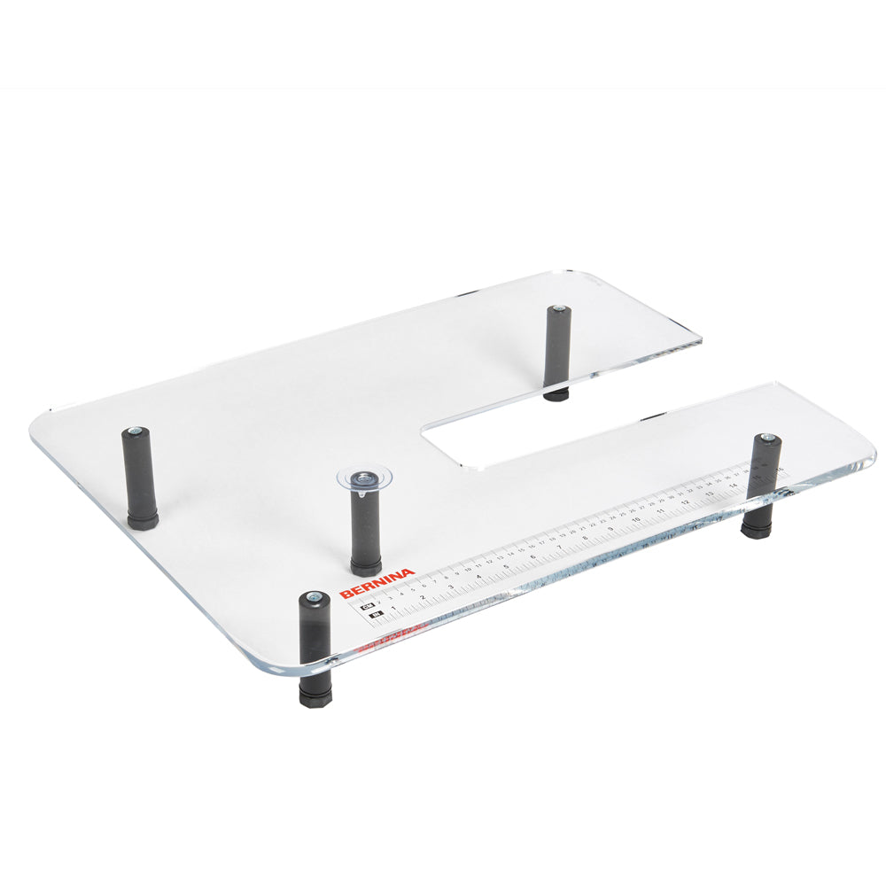 The Plexiglass extension table makes light work of Ruler Quilting projects such as throws, quilts and wall hangings, increasing your work surface and distributing the weight of the quilt evenly over the entire table.