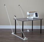 Free-motion, stitch regulator and walking foot-friendly, the Weightless Quilter lifts the quilt above the machine bed while you stitch without stress on your body. No more fighting all that bulk on small to king-size quilts. Set under any sewing table, The Weightless Quilter rises above the machine to hold the quilt and allow it to move freely while you concentrate on creating beautiful quilting stitches.