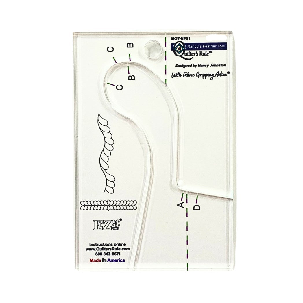 The Quilter's Rule Small Feather Tool is a versatile quilting template designed by Nancy Johnston that makes stitching beautiful feathers quick and easy. This clever template works on both straight lines and curves, giving you the flexibility to create elegant feathered designs across borders, blocks, and decorative fills.