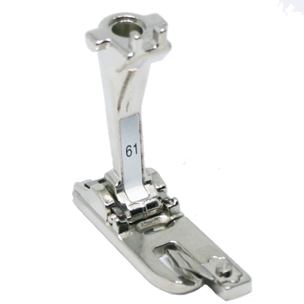 When working with Zigzag hemmer #61, the fabric is fed into a scroll, which turns the edge under twice. This prevents the fabric from fraying later. The guide holds together the turned hem until it reaches the needle.