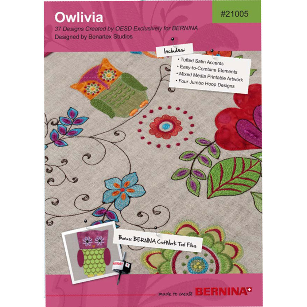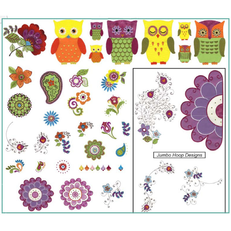 This Embroidery Collection features 37 whimsical designs for machine embroidery. Charming owls used alone, or combined resting on sweeping flora perches are ready to adorn your creations, from home decor to quilts to baby gifts.