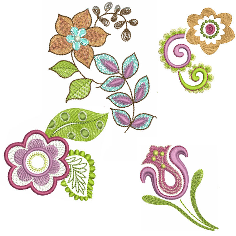 Mod flowers and paisley accents provide added pop. Touches of tufted satin give select designs dimension, and unique fill stitches provide a contemporary flair.
