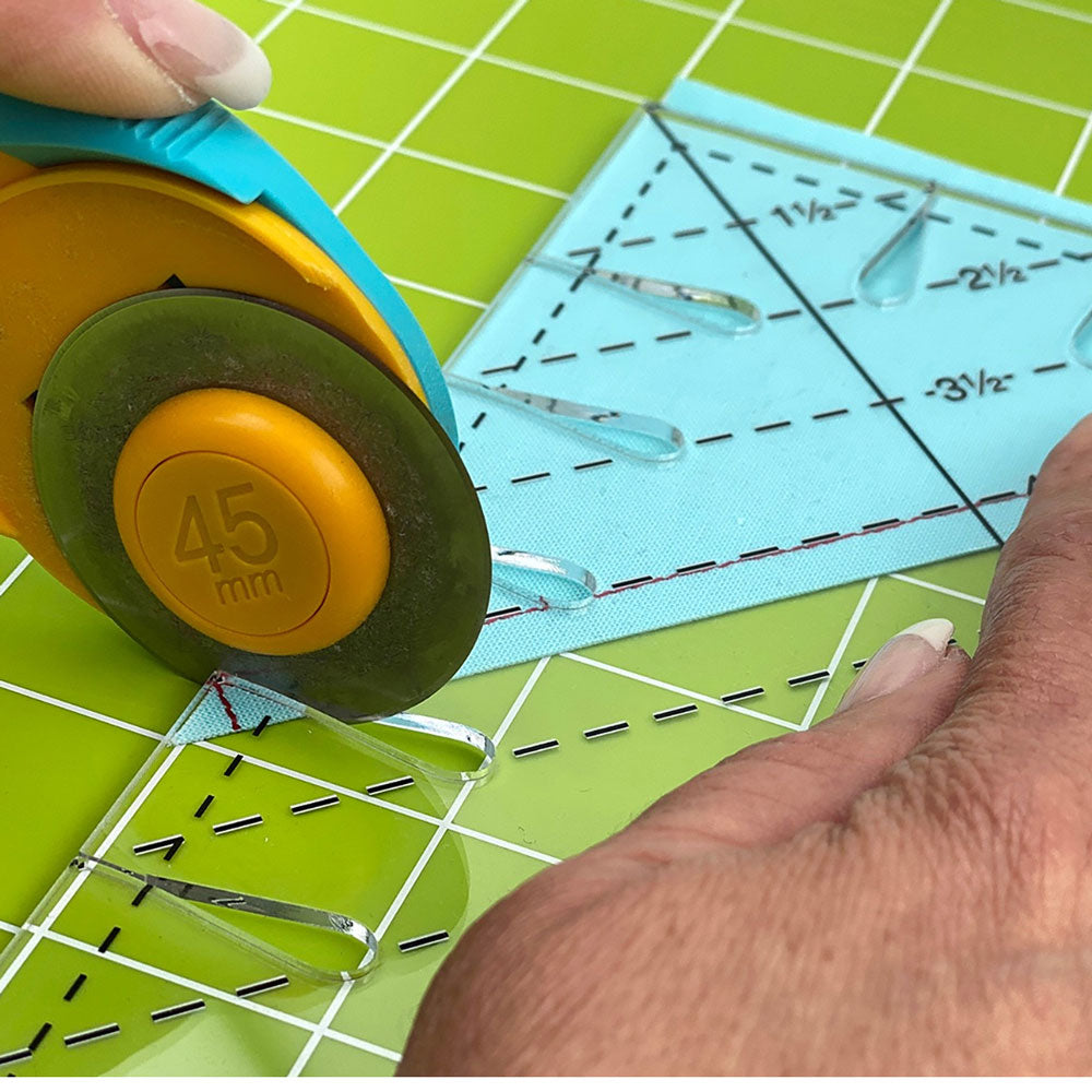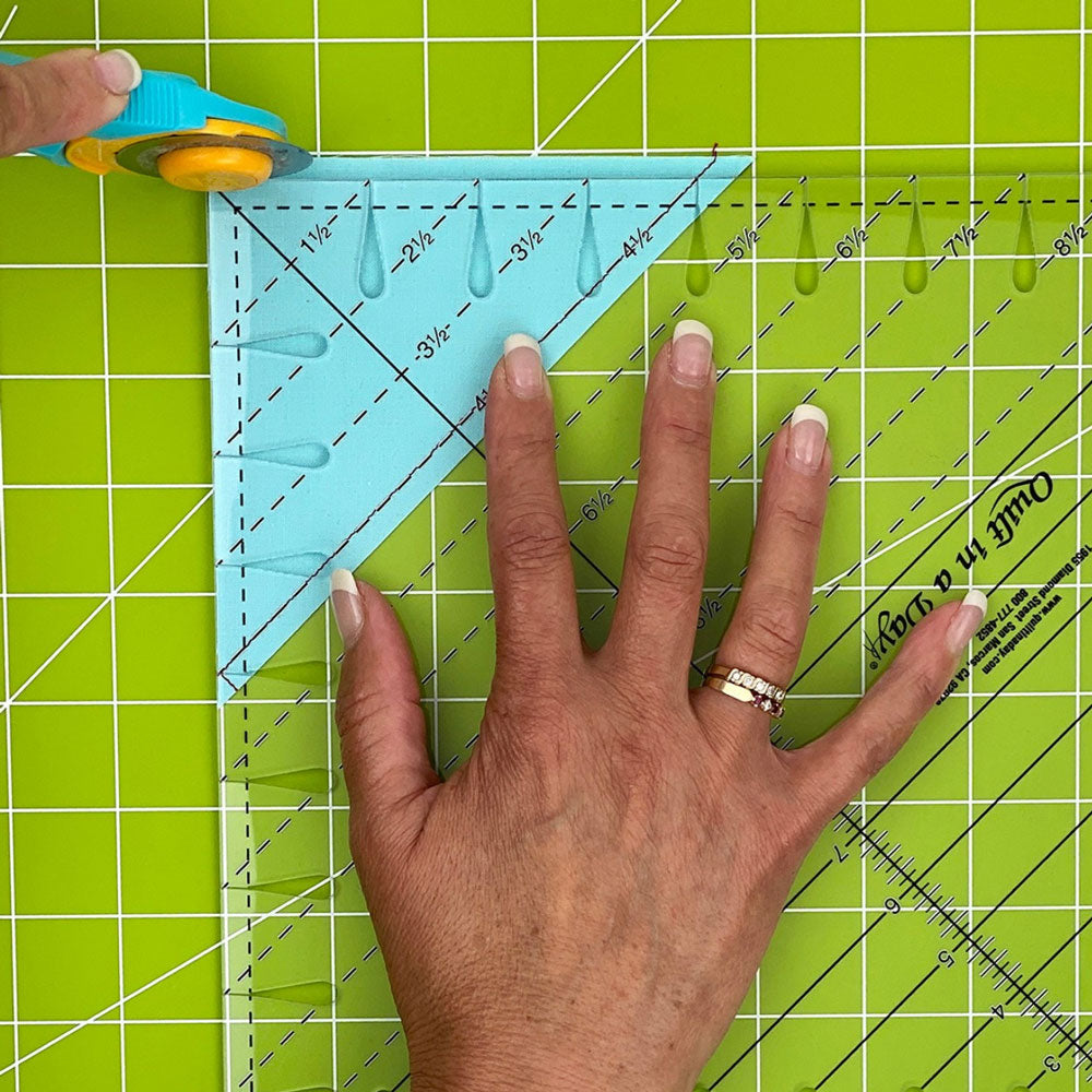 Built-in tip-trimming grooves at 1" and ½" increments allow triangle points to be trimmed neatly and accurately without additional measuring. The ruler squares triangle patches up to 9½", making it ideal for larger blocks and quilt designs that rely on precise triangle construction.