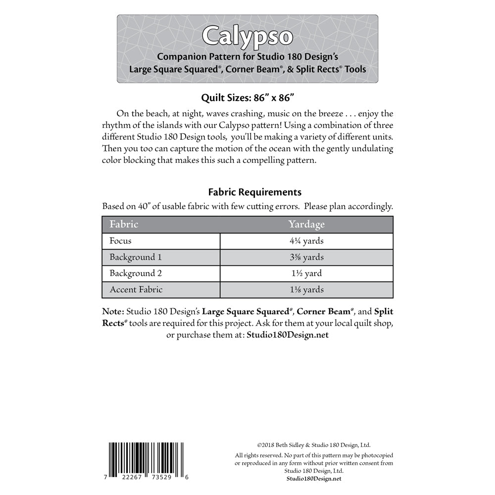 On the beach, at night, waves crashing, music on the breeze... enjoy the rhythm of the islands with our Calypso pattern! Using a combination of three different Studio 180 Design tools, you’ll be making a variety of different units as you build the four Calypso blocks. Then you too can capture the motion of the ocean with the gently undulating colour blocking that makes this such a compelling pattern.