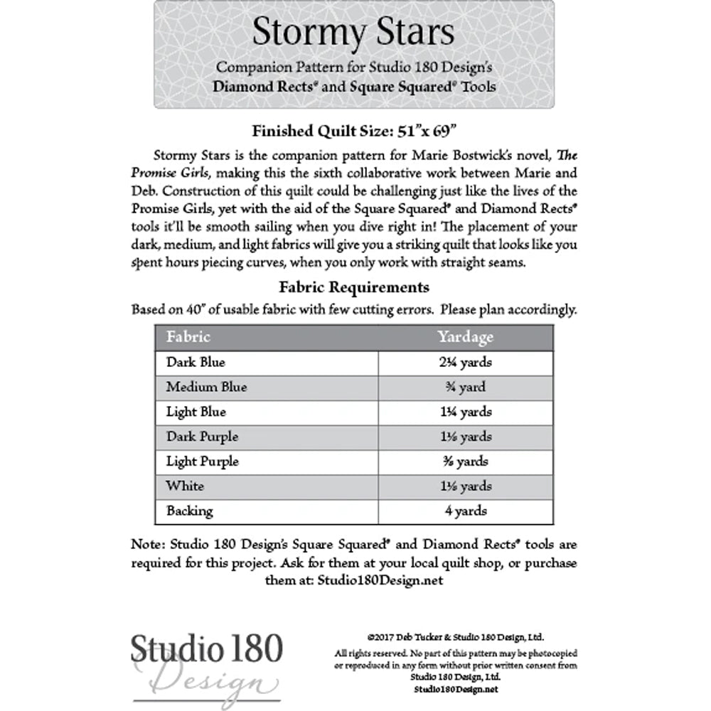 Stormy Stars is the companion pattern for Marie Bostwick’s novel, The Promise Girls, making this the sixth collaborative work between Marie and Deb. Construction of this quilt could be challenging just like the lives of the Promise Girls, yet with the aid of Studio 180 Design’s Diamond Rects and Square Squared tools, it’ll be smooth sailing when you dive right into this project!