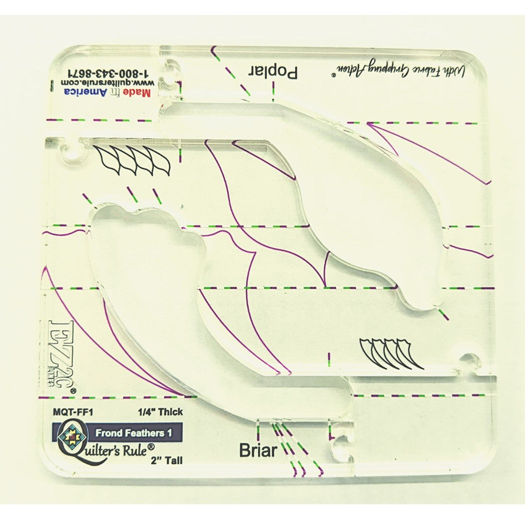 The Quilter's Rule Frond Feathers 1 Briar & Poplar is a versatile quilting template that brings organic, flowing designs to your ruler quilting projects. This single template combines two complementary feather shapes, making it ideal for borders, sashing, and decorative fills across your quilt.