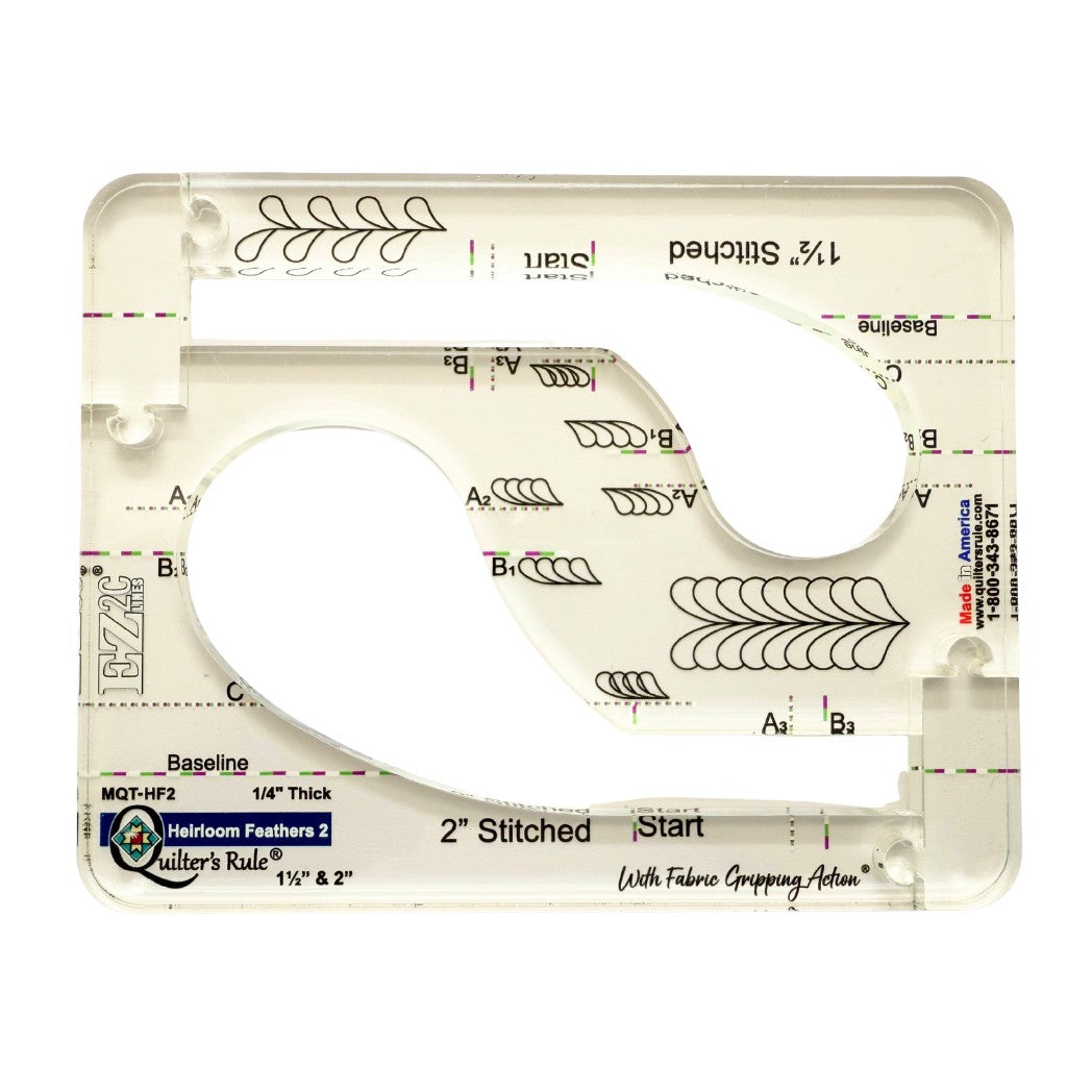 The Quilter's Rule Heirloom Feathers #2 template is a versatile quilting ruler that extends your ruler quilting options while maintaining accuracy and control. This single template features two elegant feather sizes, making it ideal for creating smooth, continuous feather designs with professional precision.