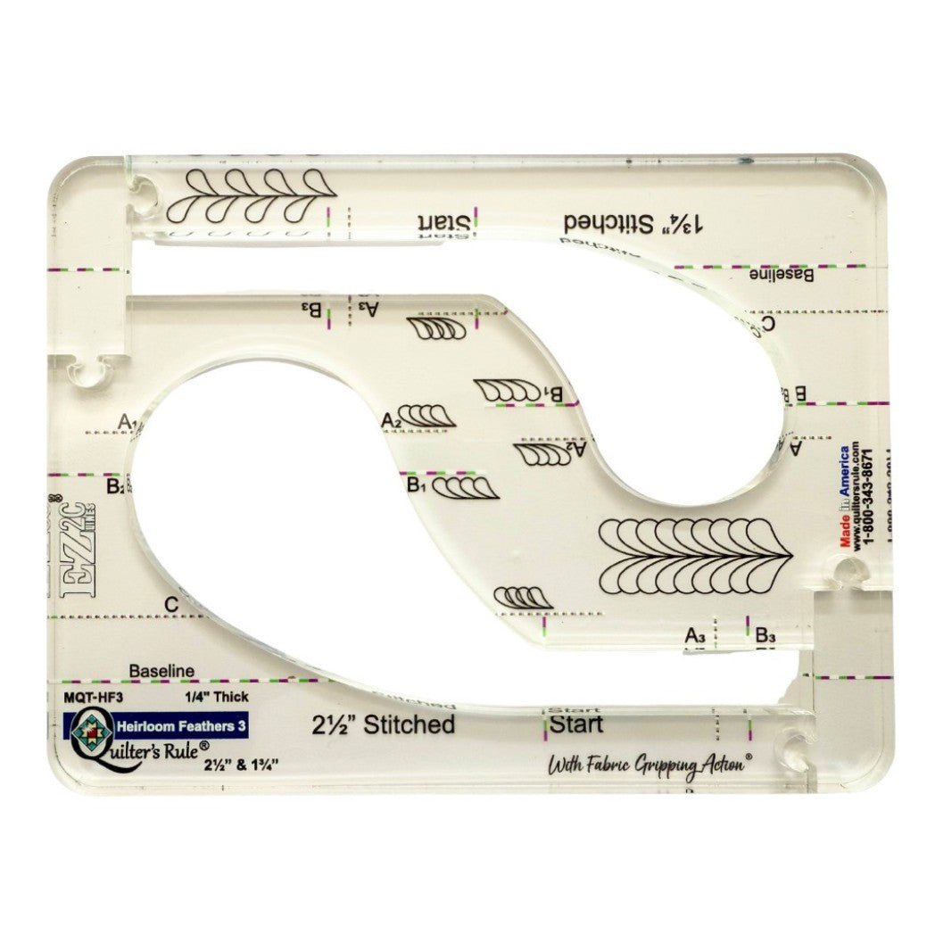 The Quilter's Rule Heirloom Feathers #3 template is a versatile quilting ruler that extends your ruler quilting options while maintaining accuracy and control. This single template features two elegant feather sizes, making it ideal for creating smooth, continuous feather designs with professional precision.