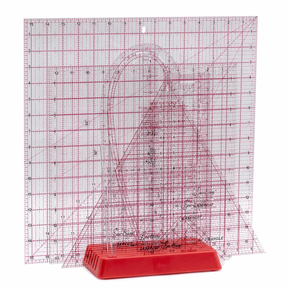 6 universal slots and 3 smalls slots for different size and shape templates and rulers. 1 mini slot for a Quilters Quarter in ¼" (6mm). Fits all sizes and shapes of templates and rulers 1/8" thick (3mm). Non-skid rubber feet prevent slipping.