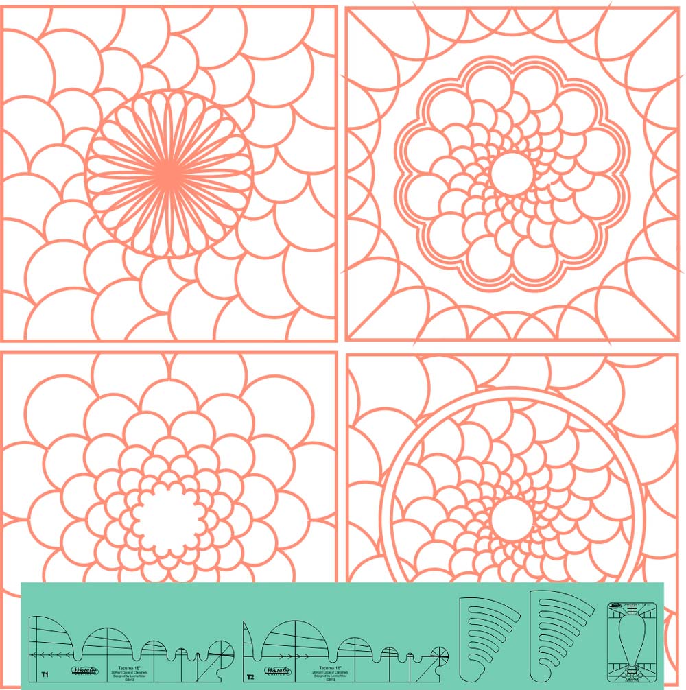 Tecoma is the perfect Template to quilt with Leonie’s TempLeeQuilting Technique as it shows off the feature fabric to perfection. A Tecoma pattern is a spectacular design in its own right when used alone, or Tecoma variations can be subtle when used to fill an area. Quilted from the centre out and worked in a circular motion Tecoma is easy to quilt and has excellent potential for your creative style.