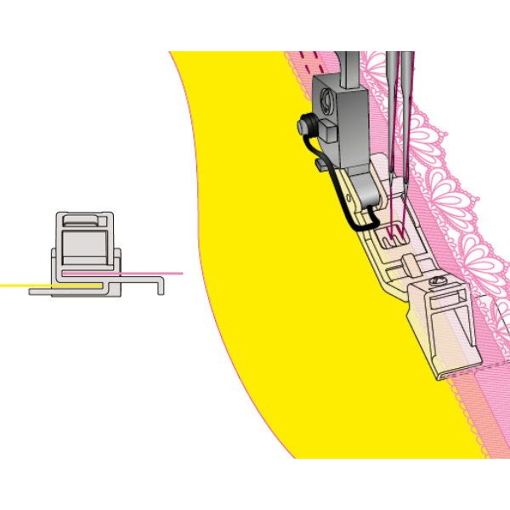 For sewing lace, trim and tapes onto hems. The bottom edge of the fabrics is simultaneously neatened with a narrow or wide coverstitch, creating a flat joining seam.