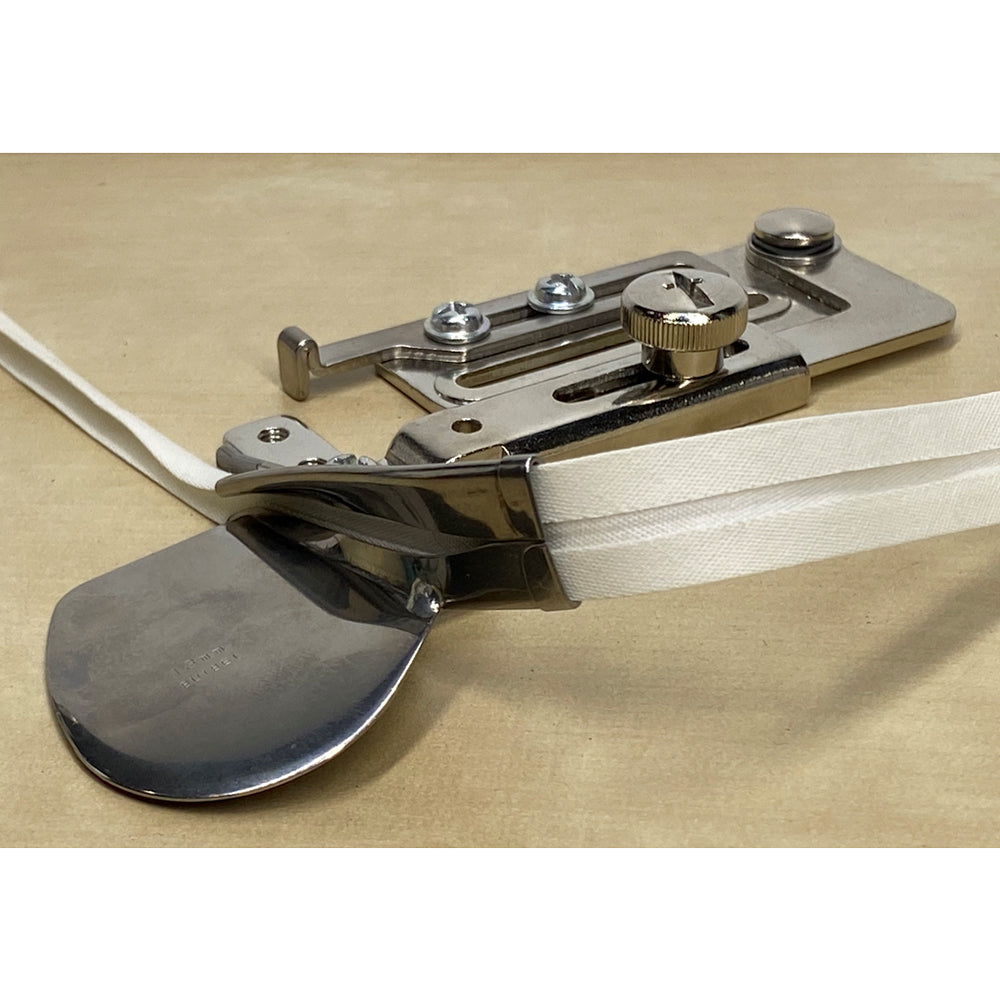 Binder attachment # 87 is the ideal tool for sewing neat edge finishes with pre-folded bias tape, providing garments, home furnishings and quilts with an even, attractive finished edge.