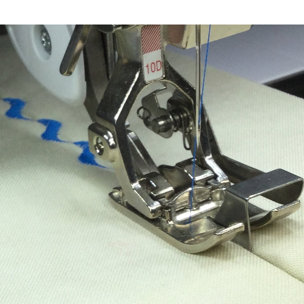 Edgestitch foot #10 is a practical help for sewing finished edges even and straight. Superbly suited to applying lace and trims, Edgestitch foot #10 is also ideal for topstitching edges, pleats and hems.